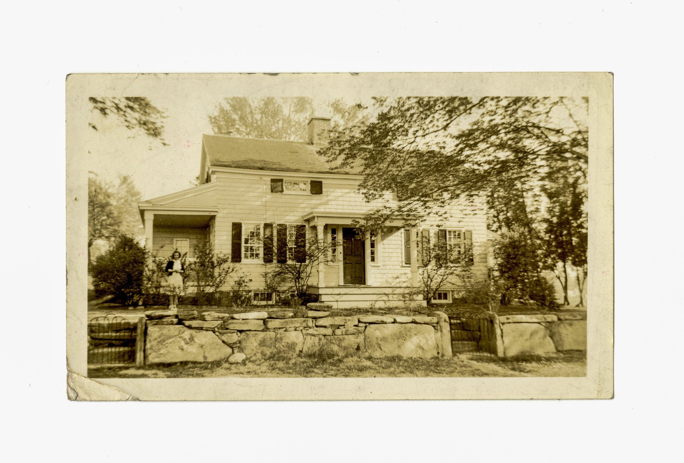 A small two story shingled home with a girl standing in front of a side door on the left of the image.Collection