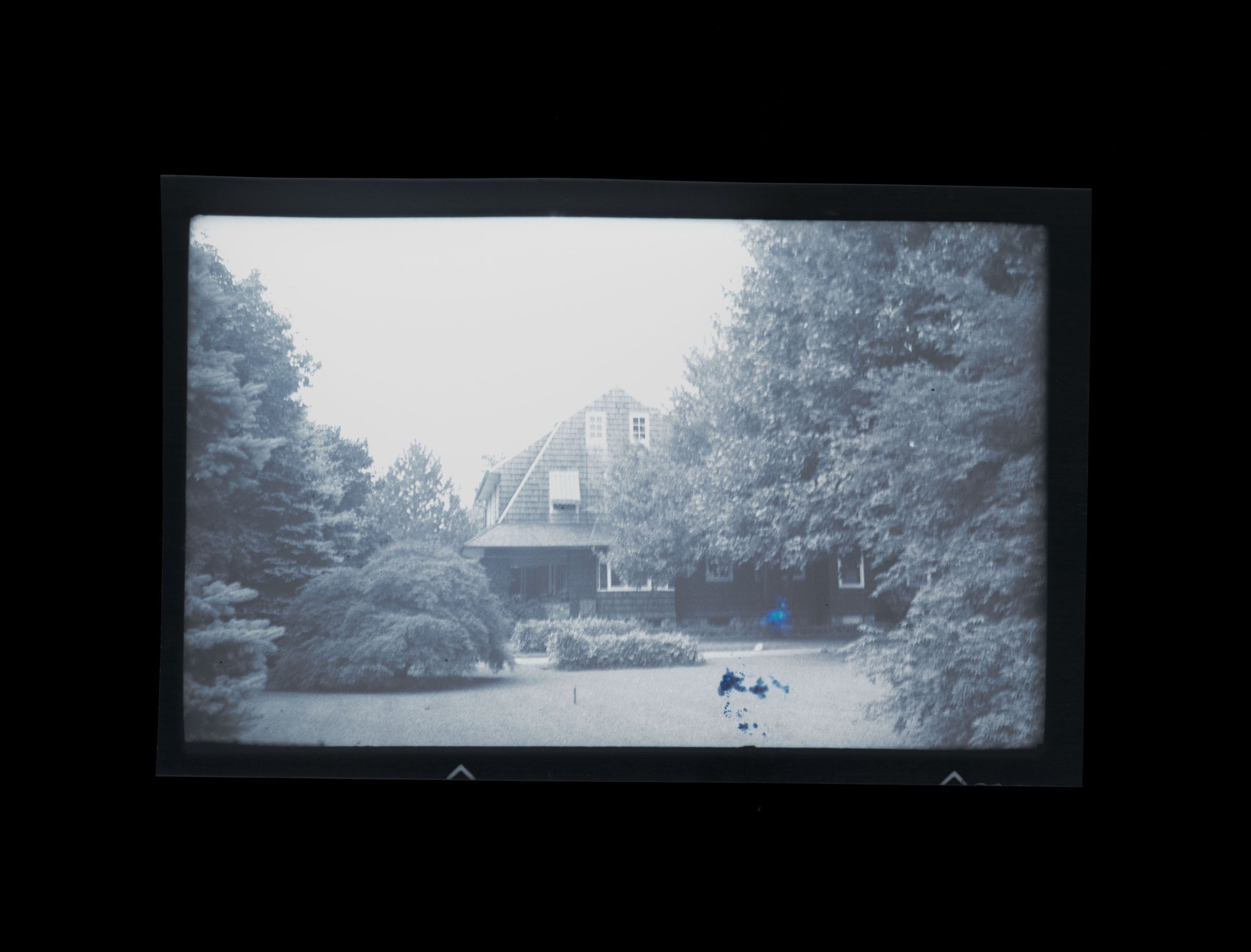 Side view of a shingle house with a gambrel style roof and its lawn.