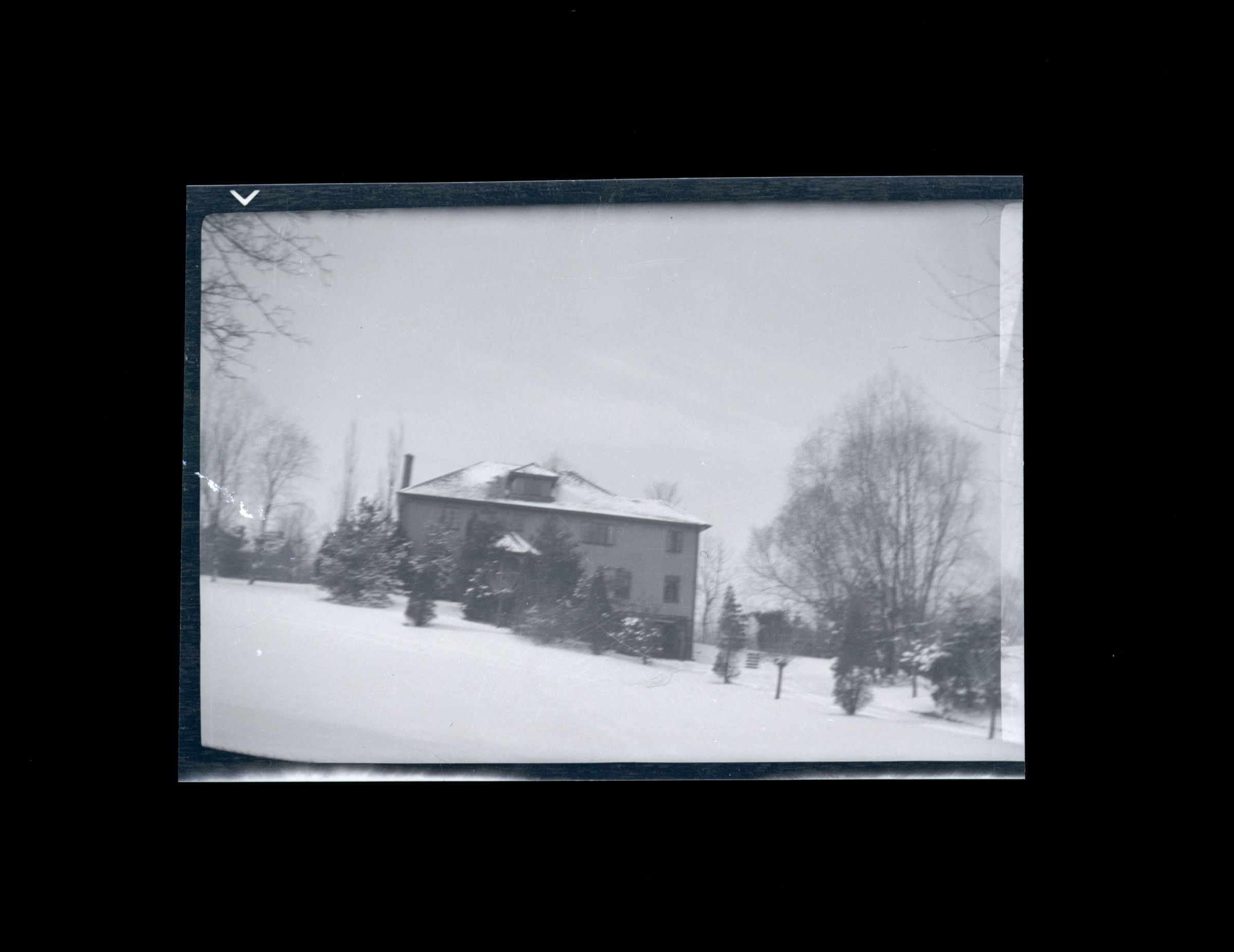 A view from the lawn of a three story house with a single door garage in the snow.Collection