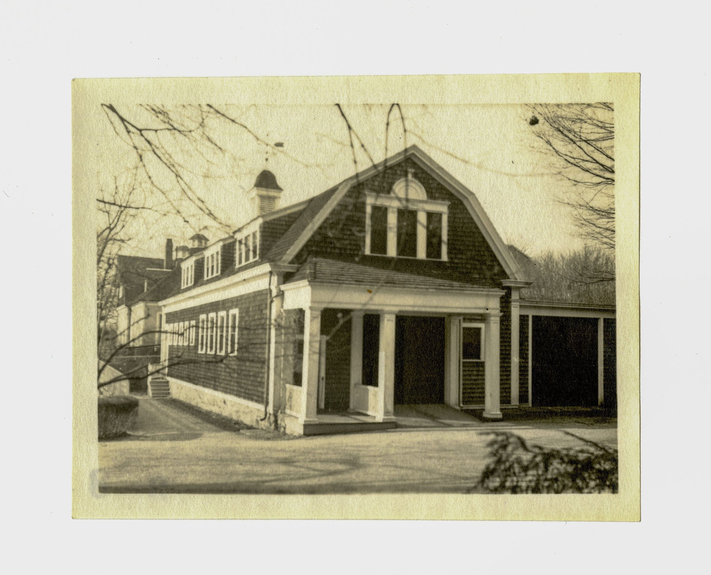 A two story shingle building with a gambrel-style roof and dormers.