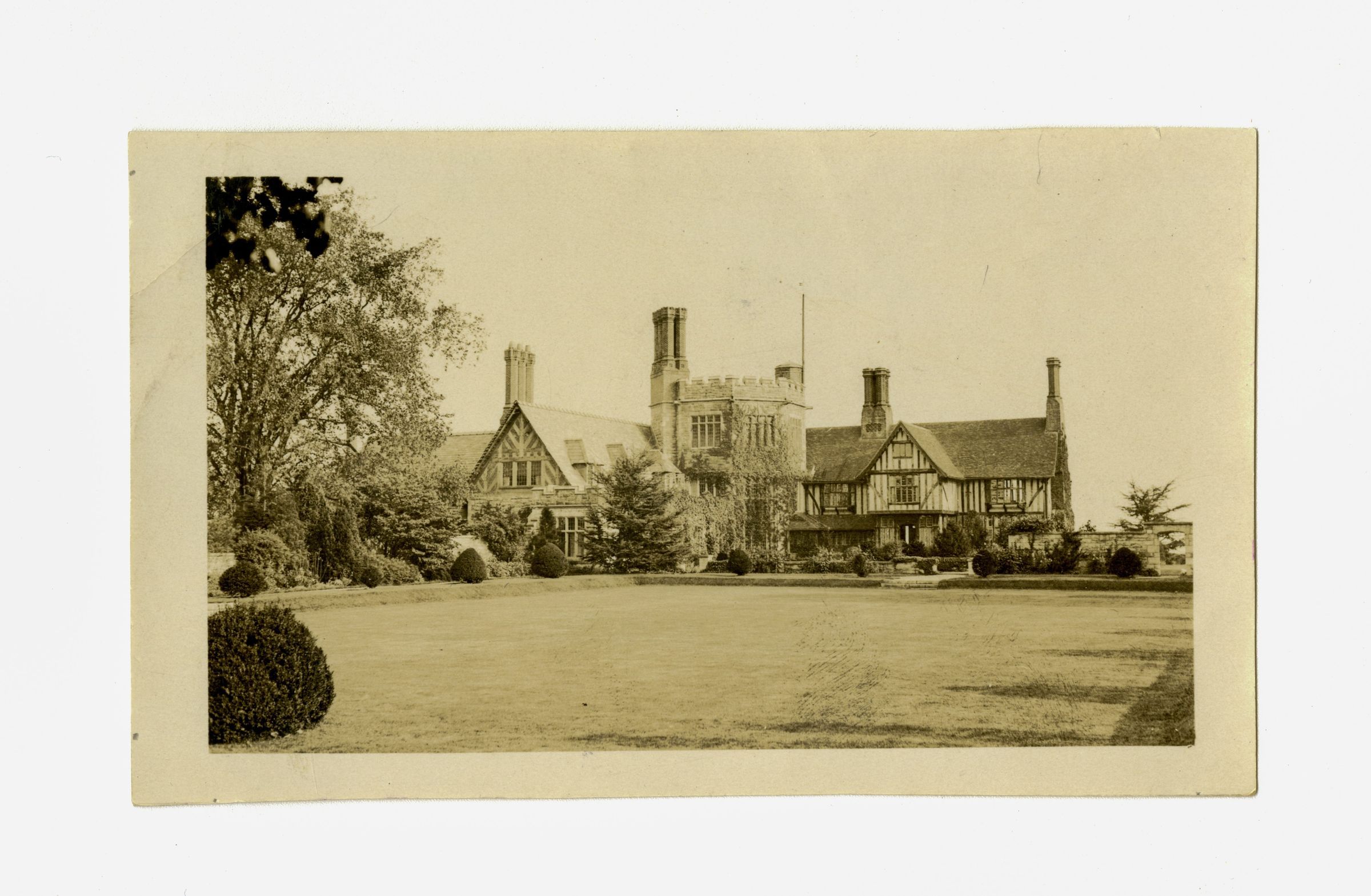 A view from the lawn of a three story Tudor-style house with a stone tower jutting out between two wings of the house.Collection
