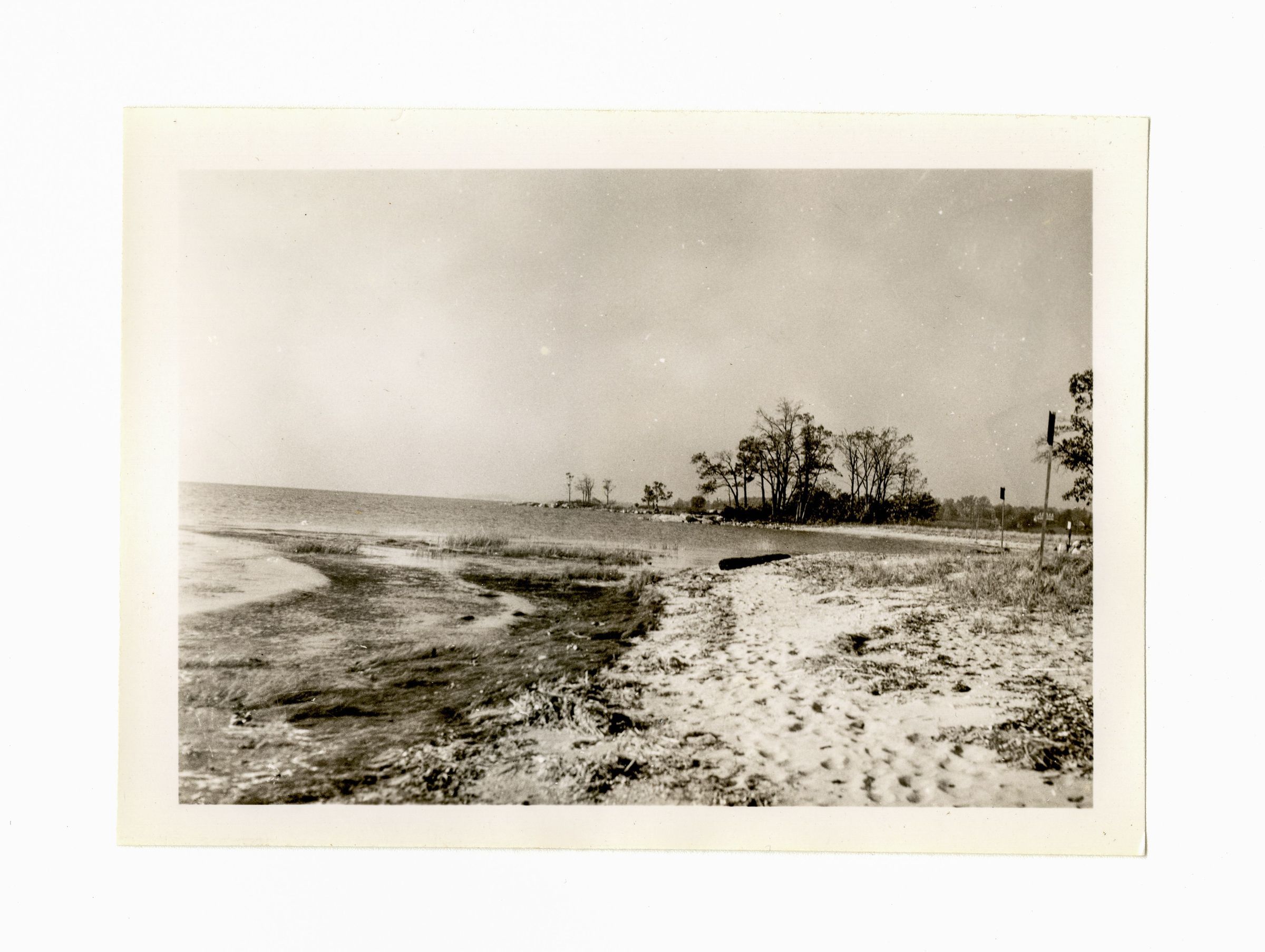 A view looking out towards a body of water, likely Indian Harbor, from a sandy beach towards the shoreline in the distance.Collection
