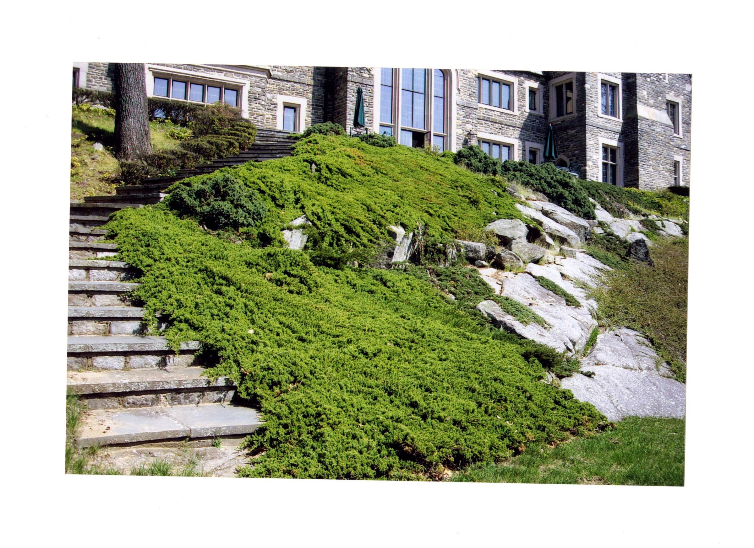 A view of plant covered rocky outcrop and a staircase leading up to the house.