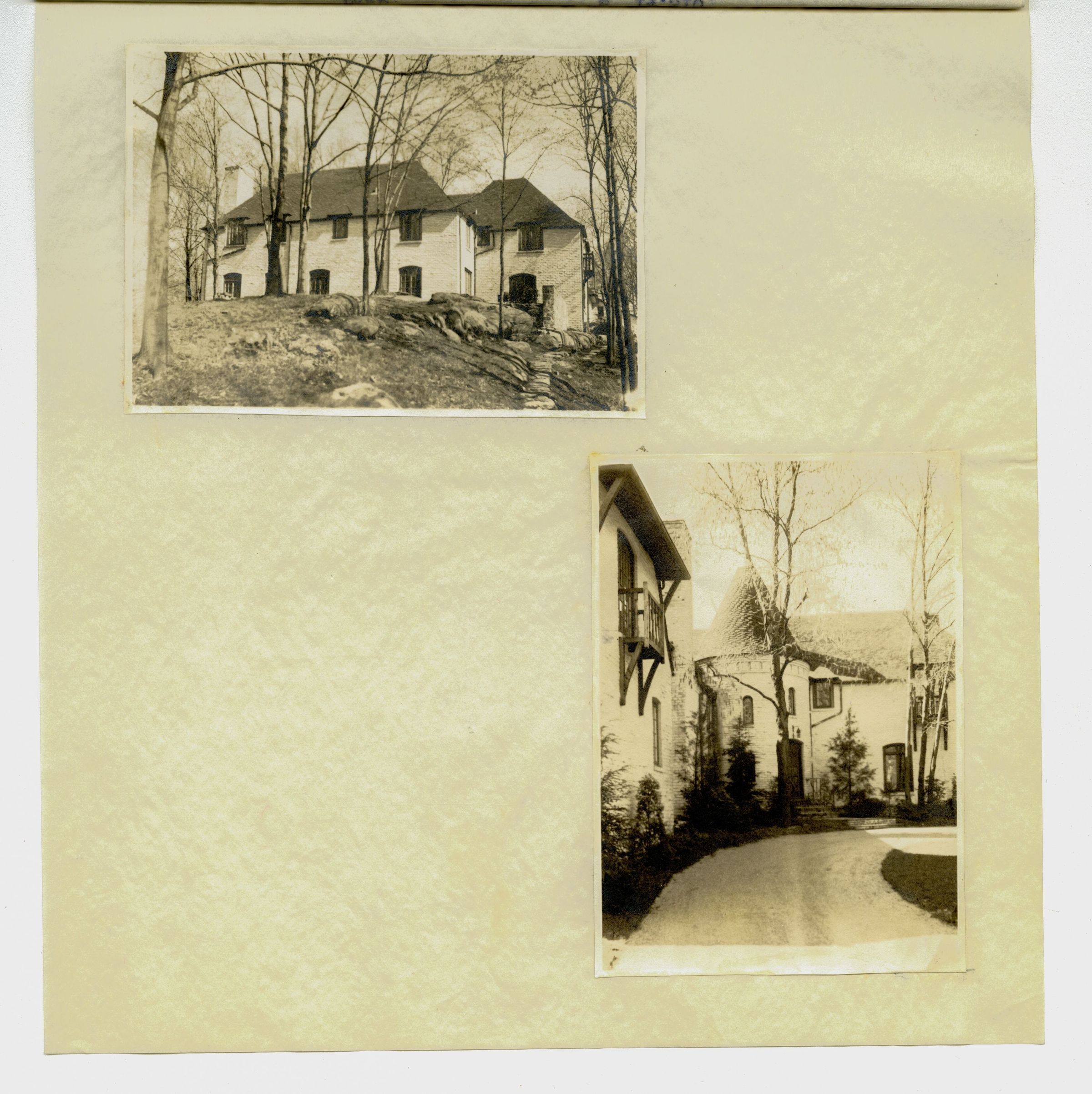 Top image is a view looking up at a brick, French-Norman style home. Bottom image is view from the driveway of the entrance to a brick French-Norman style home.Collection