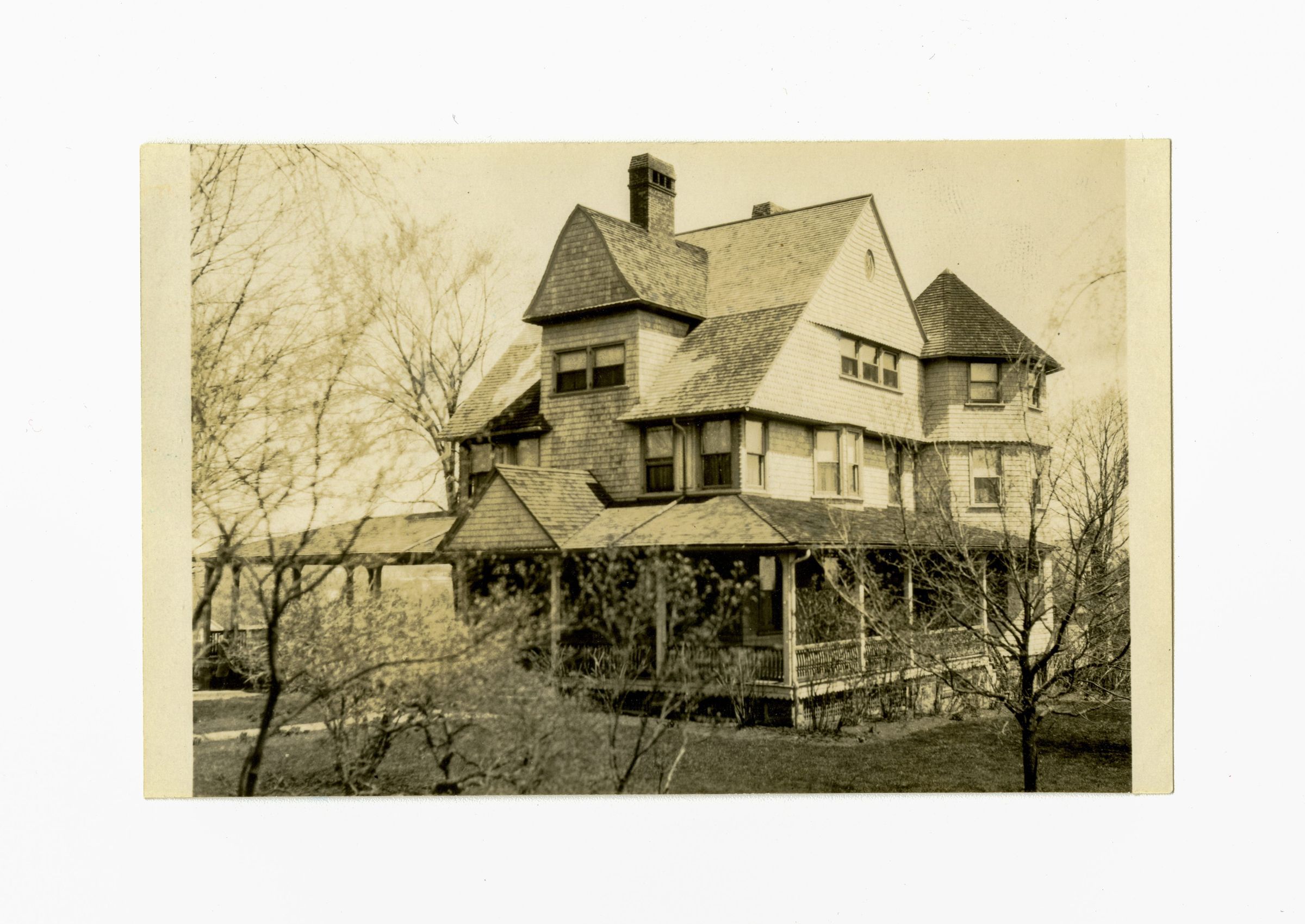 A shingled home with a wraparound porch.