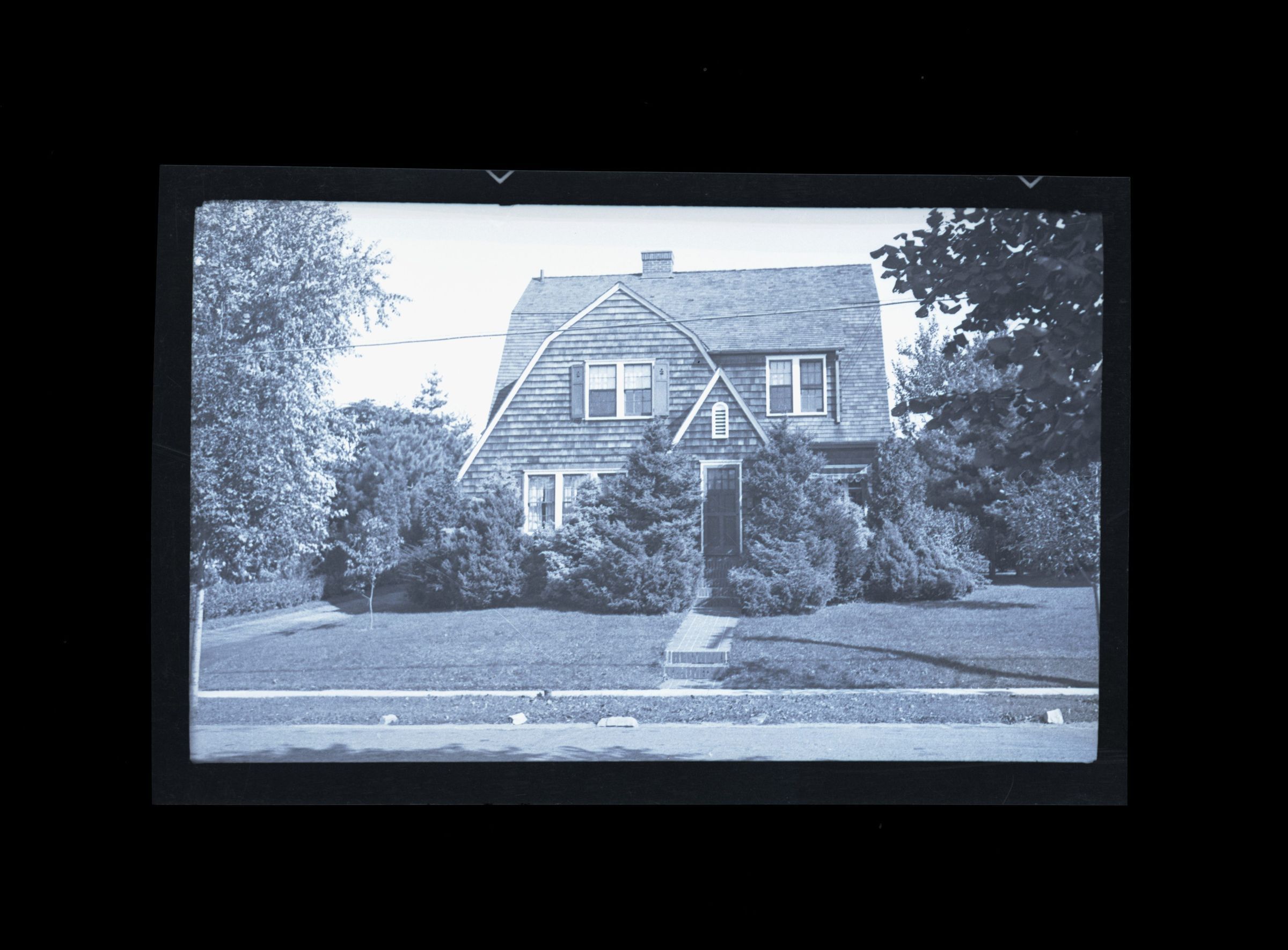 A shingle house with a gambrel-style roof and its front lawn as viewed from the street.