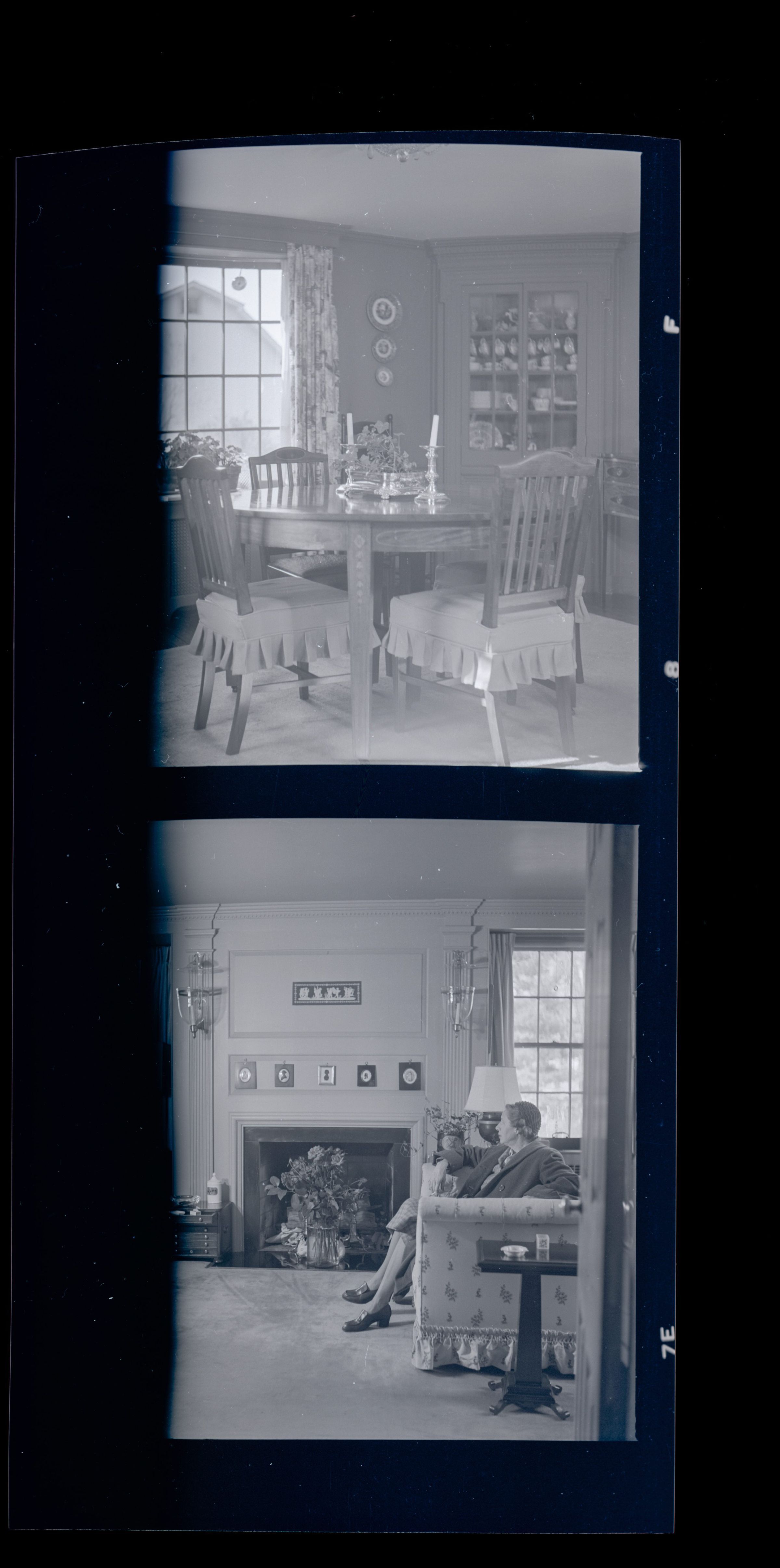 Top image is of a dining room and the bottom image is of the living room and fireplace with a woman sitting on a sofa.Collection