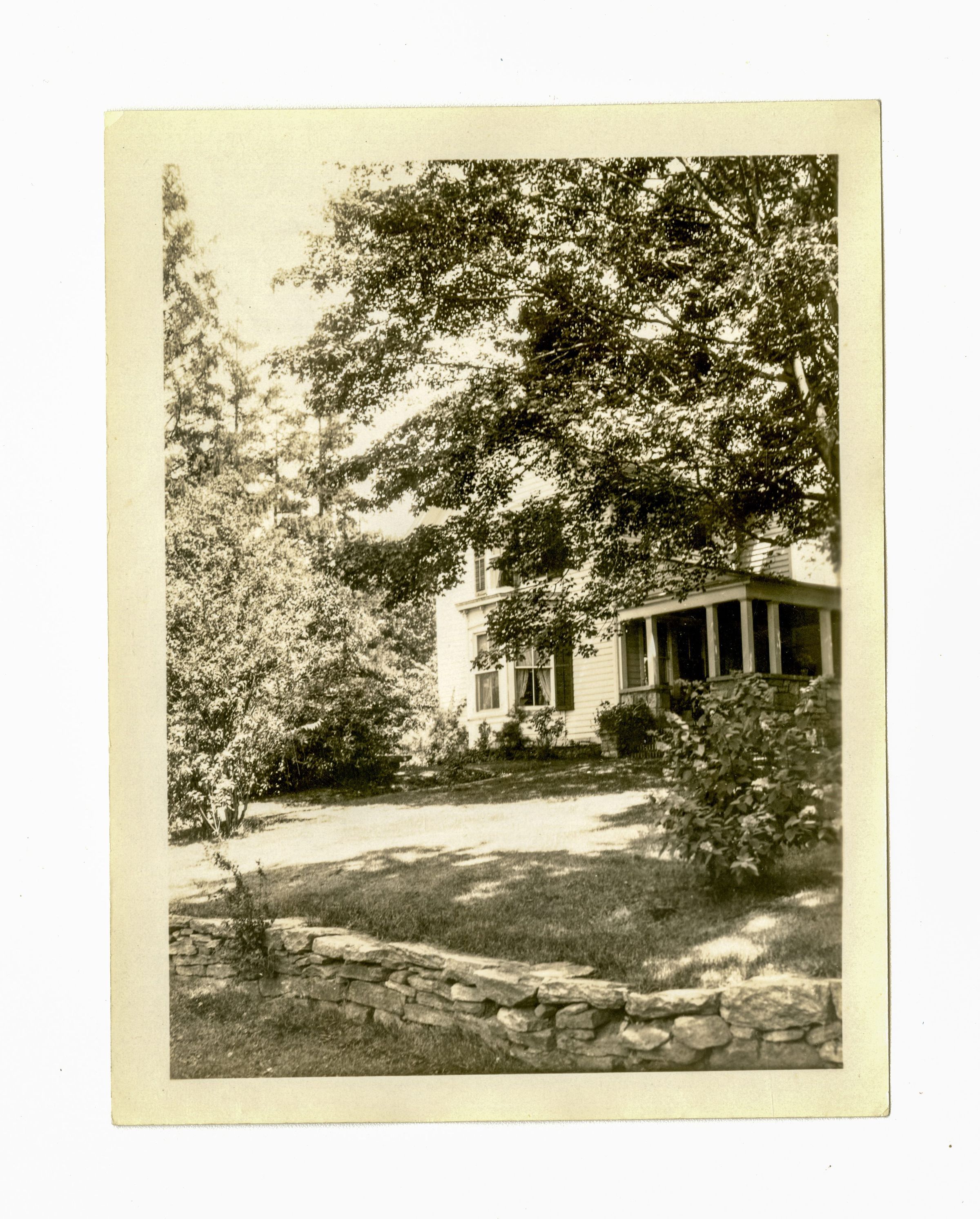 A view of a three story house and its porch, partially obscured by trees, from its lawn.Collection