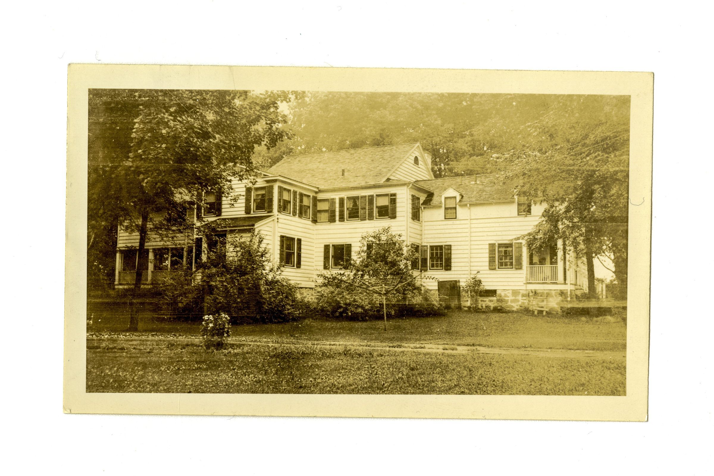 A three story clapboard house with a rotary clothes dryer in the lawn.