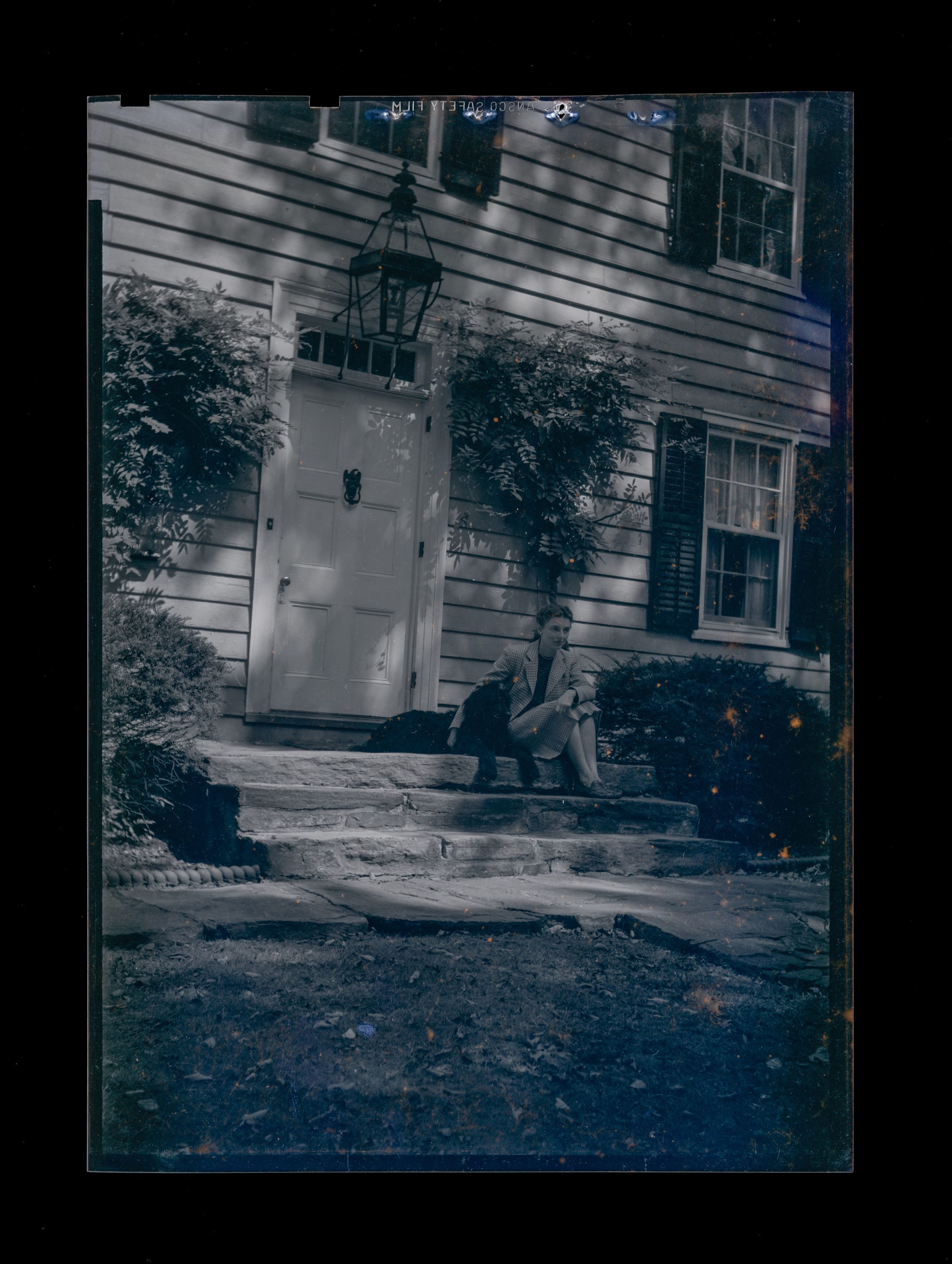 The front door of a clapboard home with a woman and dog on the steps up to the door.Collection