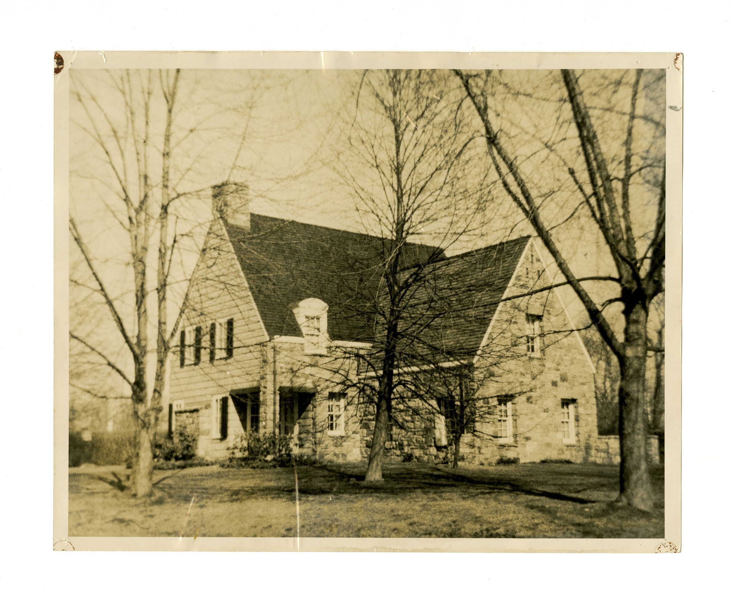 A view of a two story home with stone walls and steep roofs.