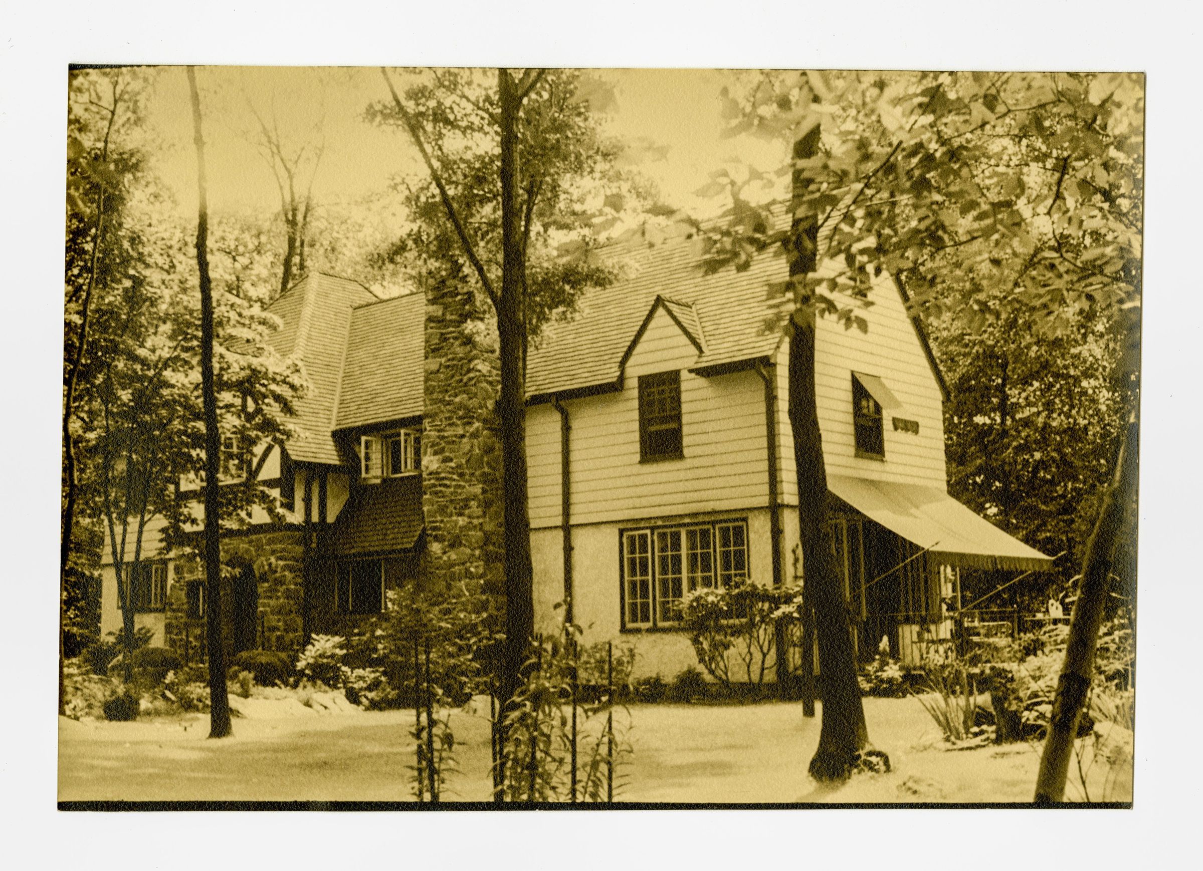 A home with a stone chimney in the snow.