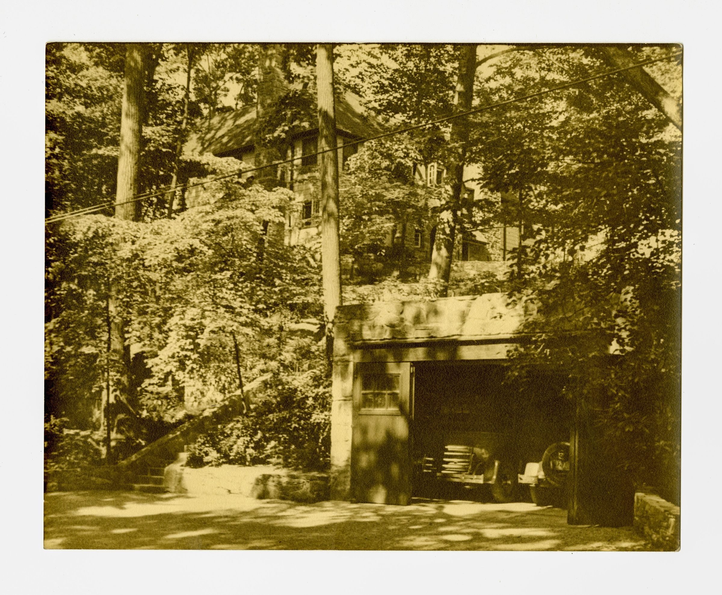 A garage with two cars parked in it with steps leading up to the house further up the hill.