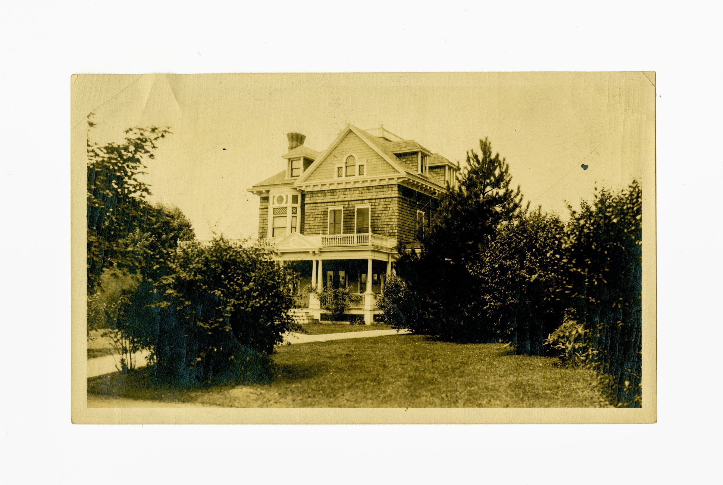 A three story shingled home.