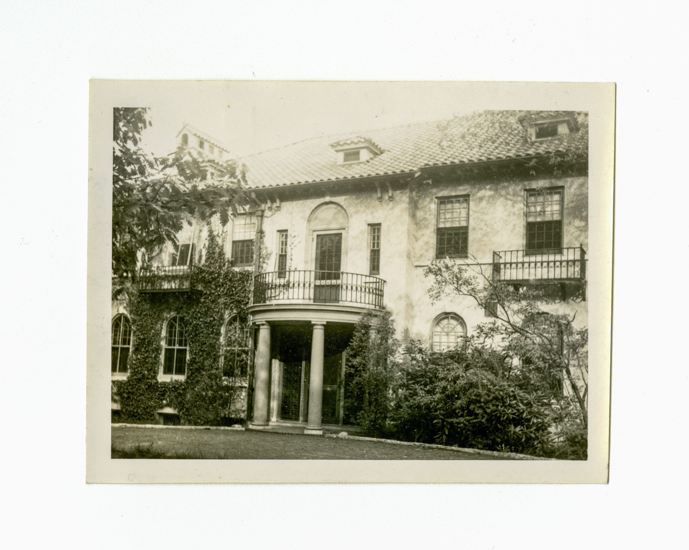 A view of an entrance to the home with a circular portico over the door.