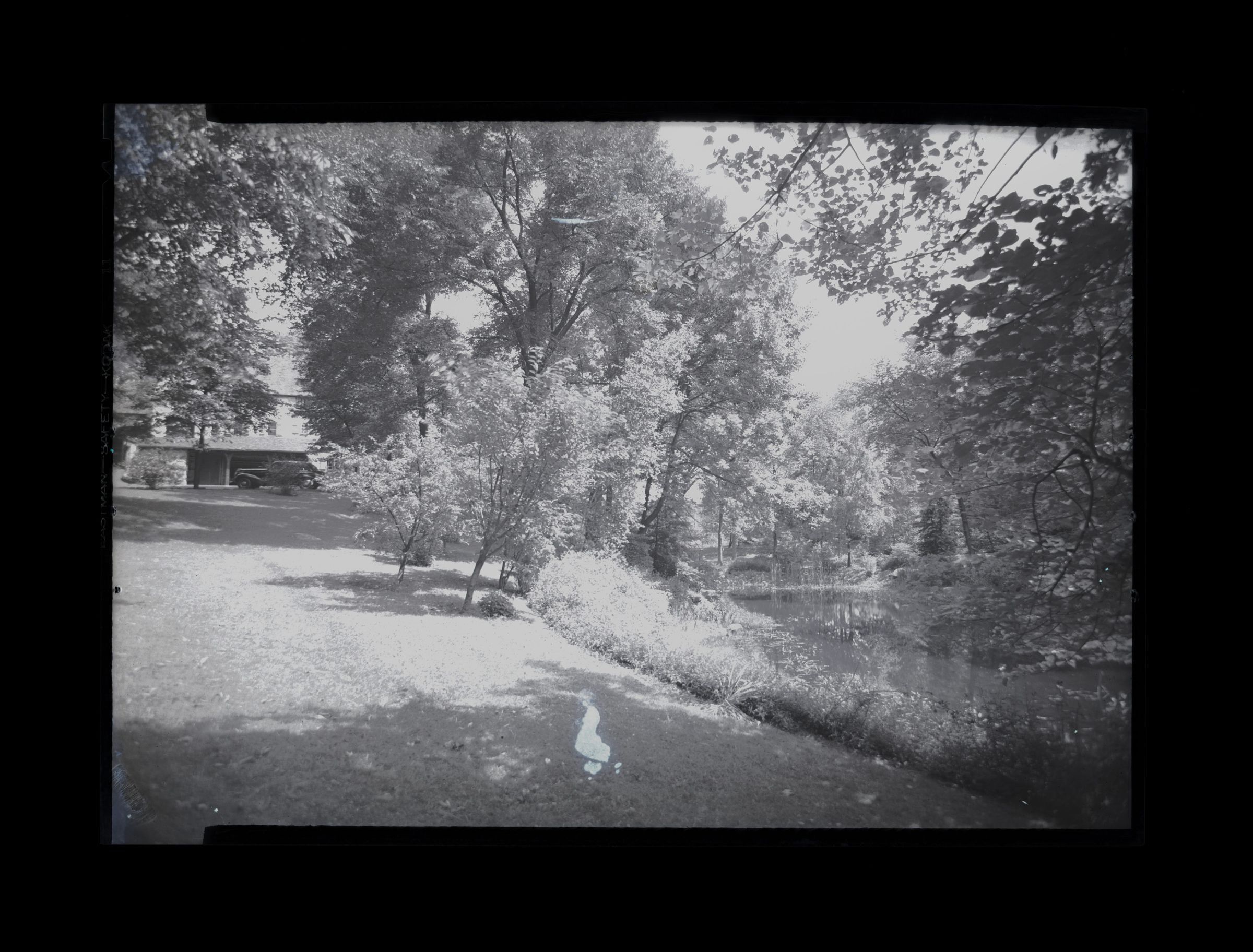A view of part of the lawn with a small pond on the right of the image and a car parked in the background.Collection