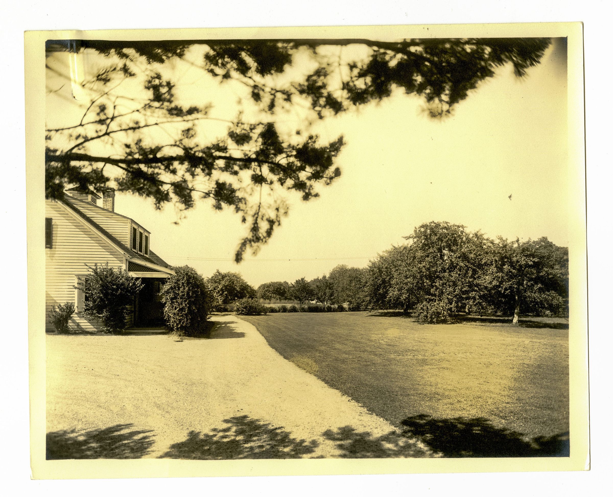 A view of a lawn, gardens, and part of a cottage on the left of the image.