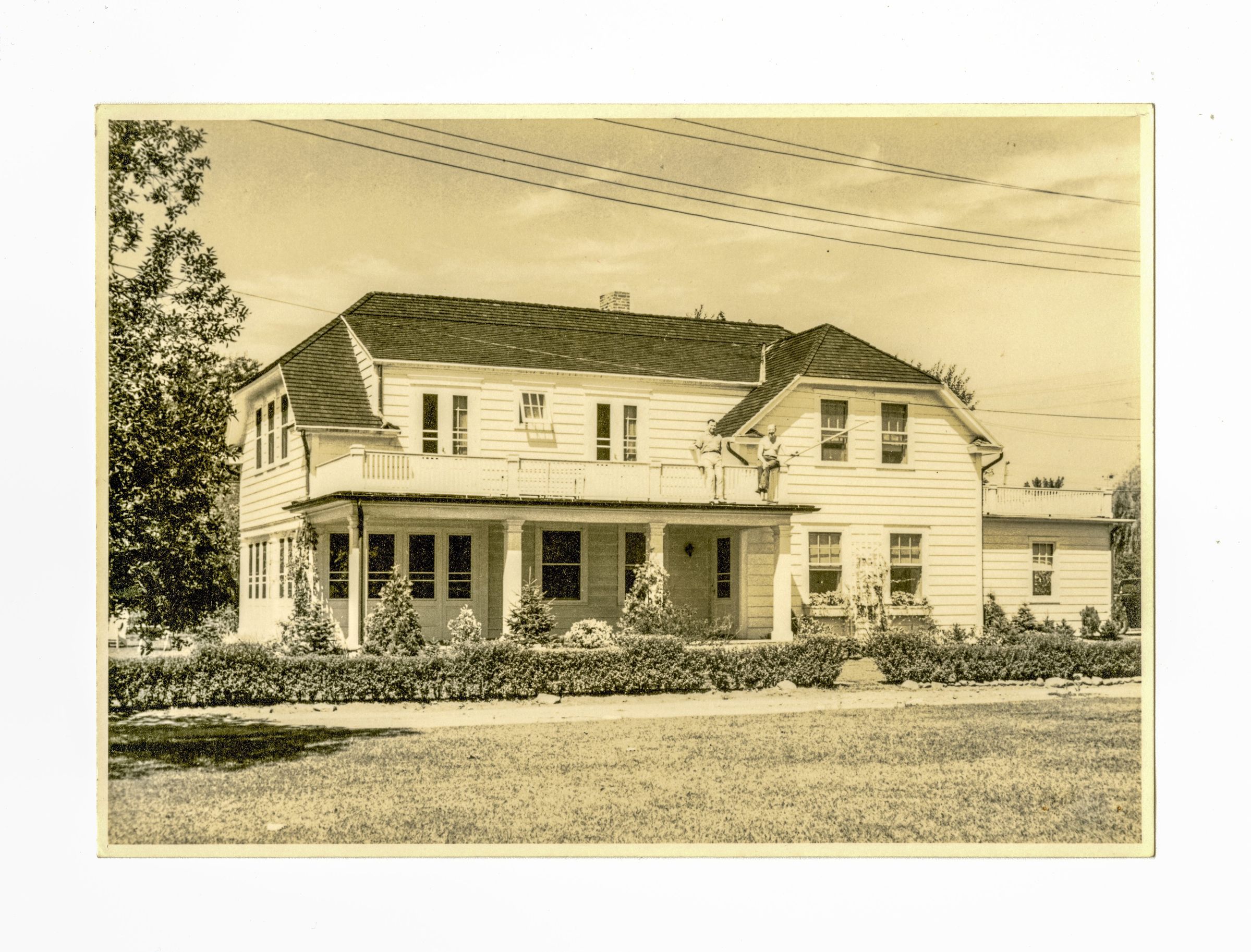 A view of the front of the home with two men sitting on the banister of the balcony.Collection