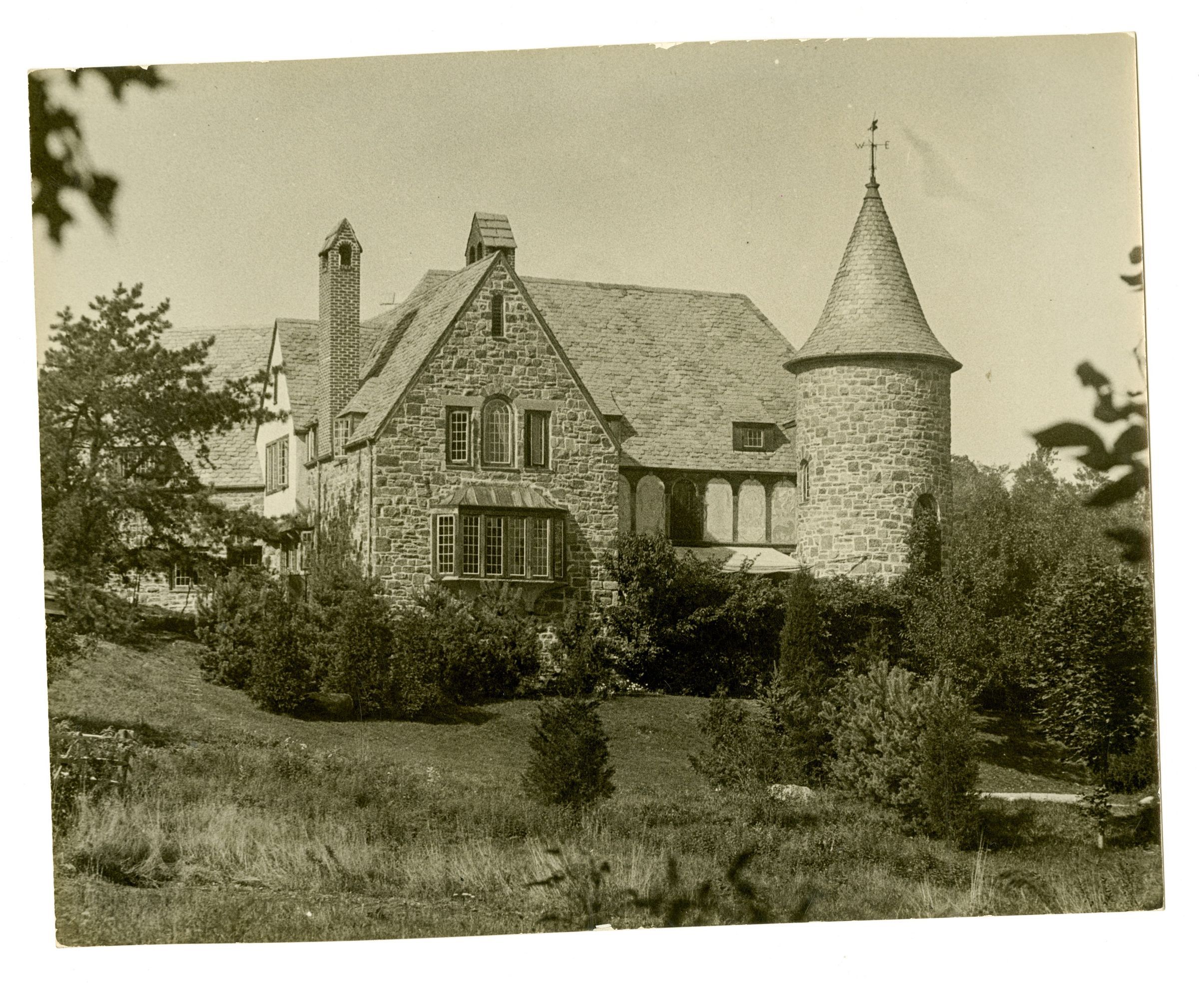 A stone, 'chateau' style home with a steeped, round tower on the right of the image.