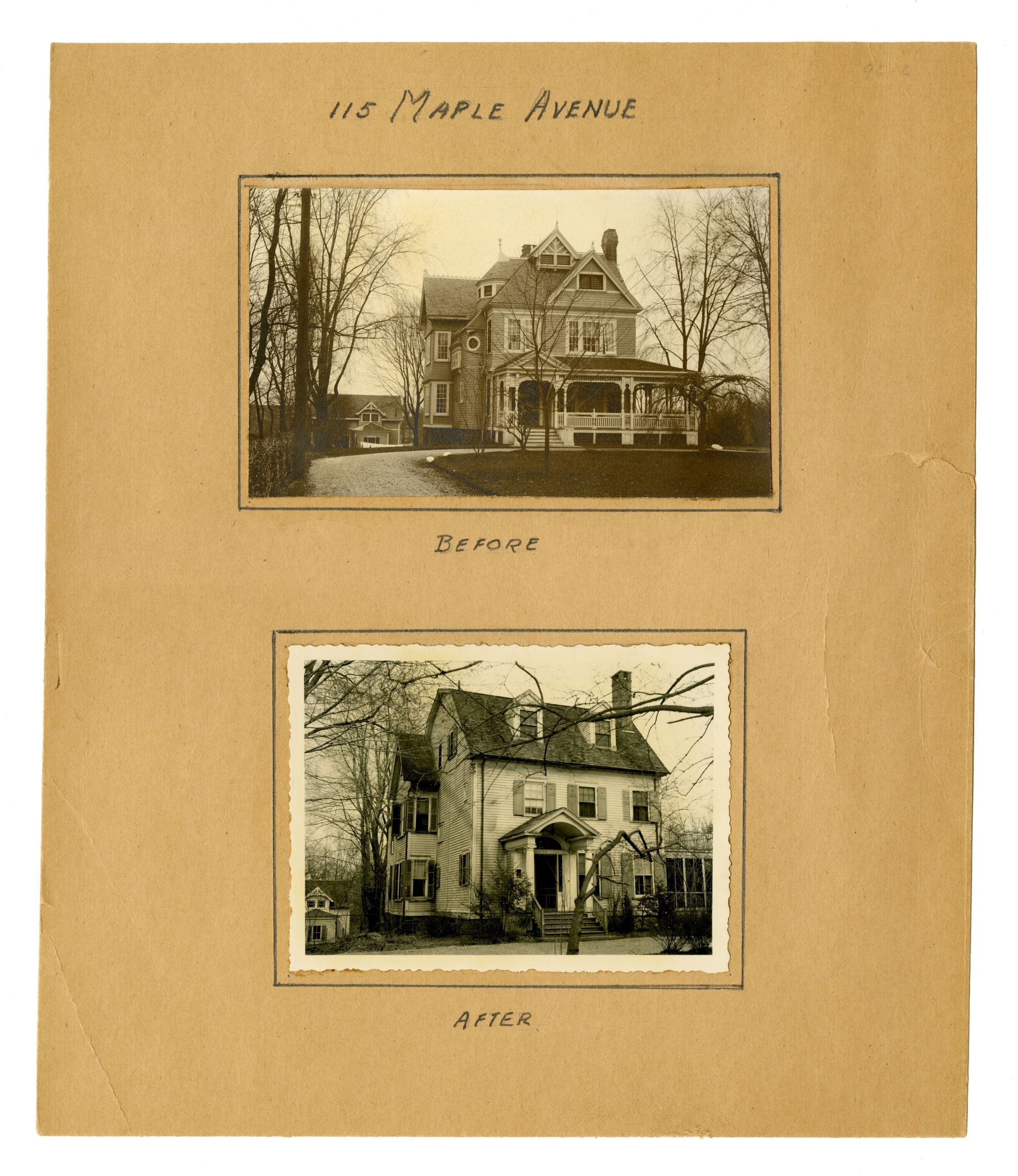 Top photo shows a home with a large porch before an extensive renovation, bottom photo shows the house after the renovation.