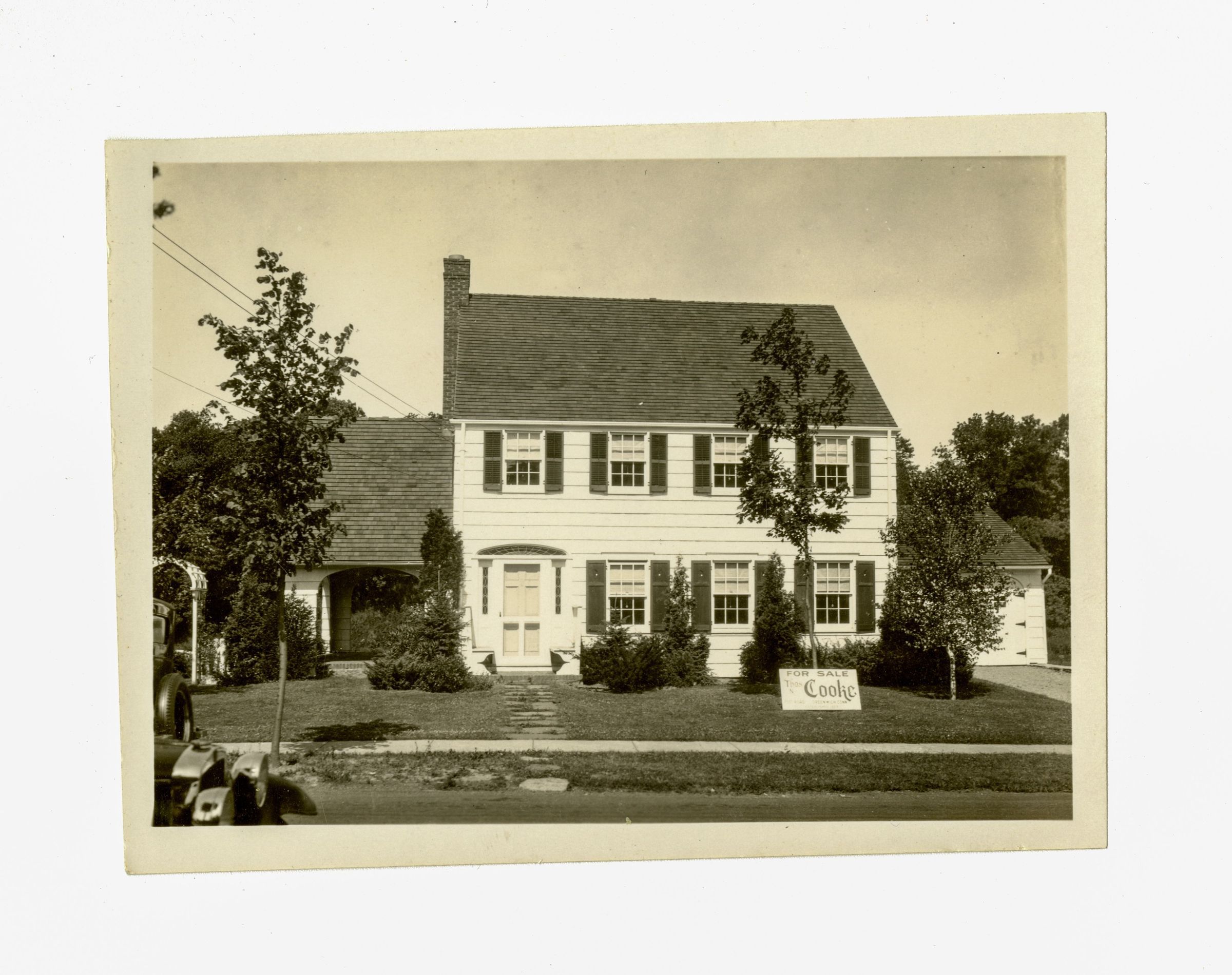 A two-story home with a garage on the right of the image. A for sale sign is on the lawn with Thomas Cooke listed.