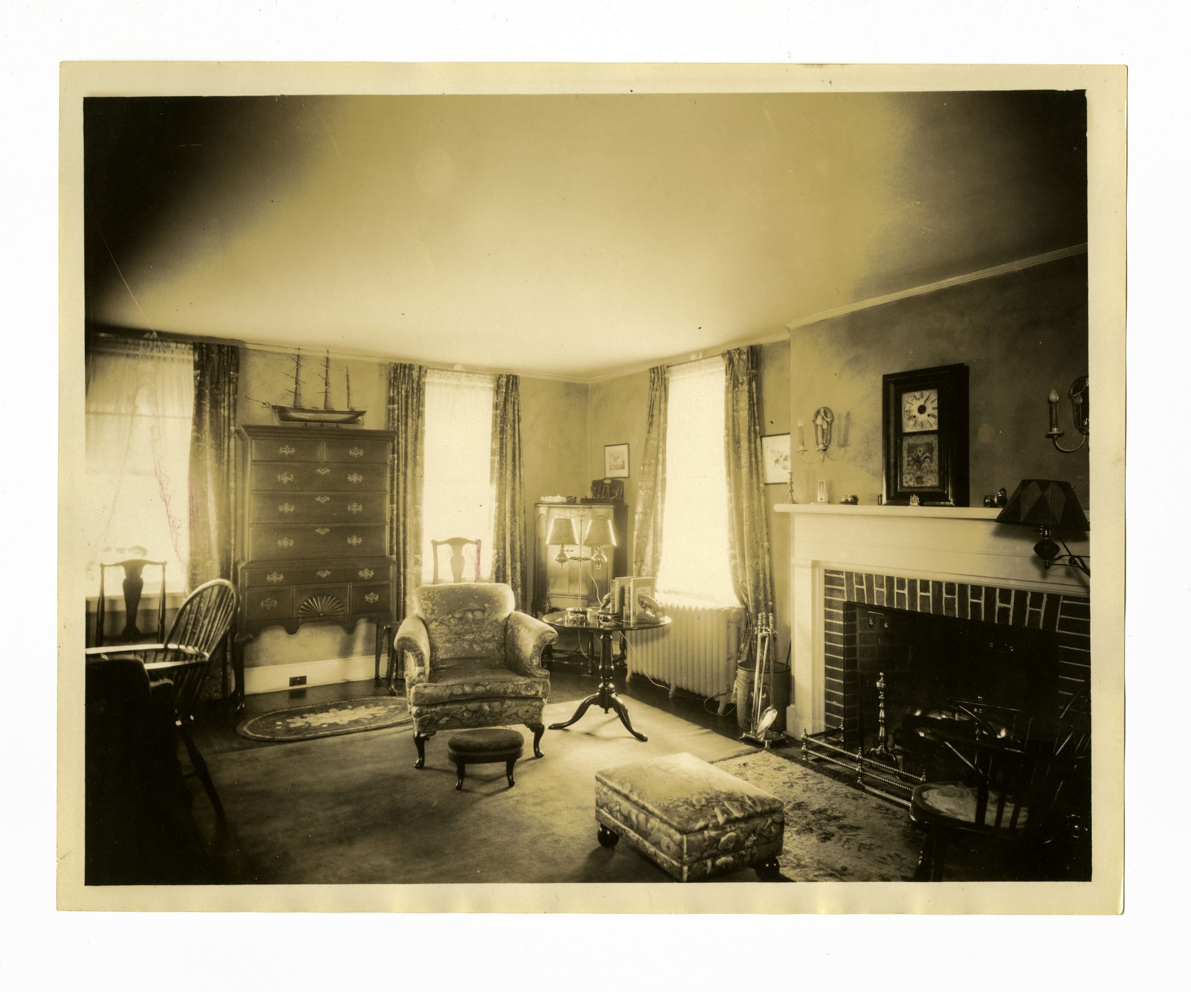 A view of part of a living room/library with a tall chest of drawers, an armchair, and a fireplace visible.Collection