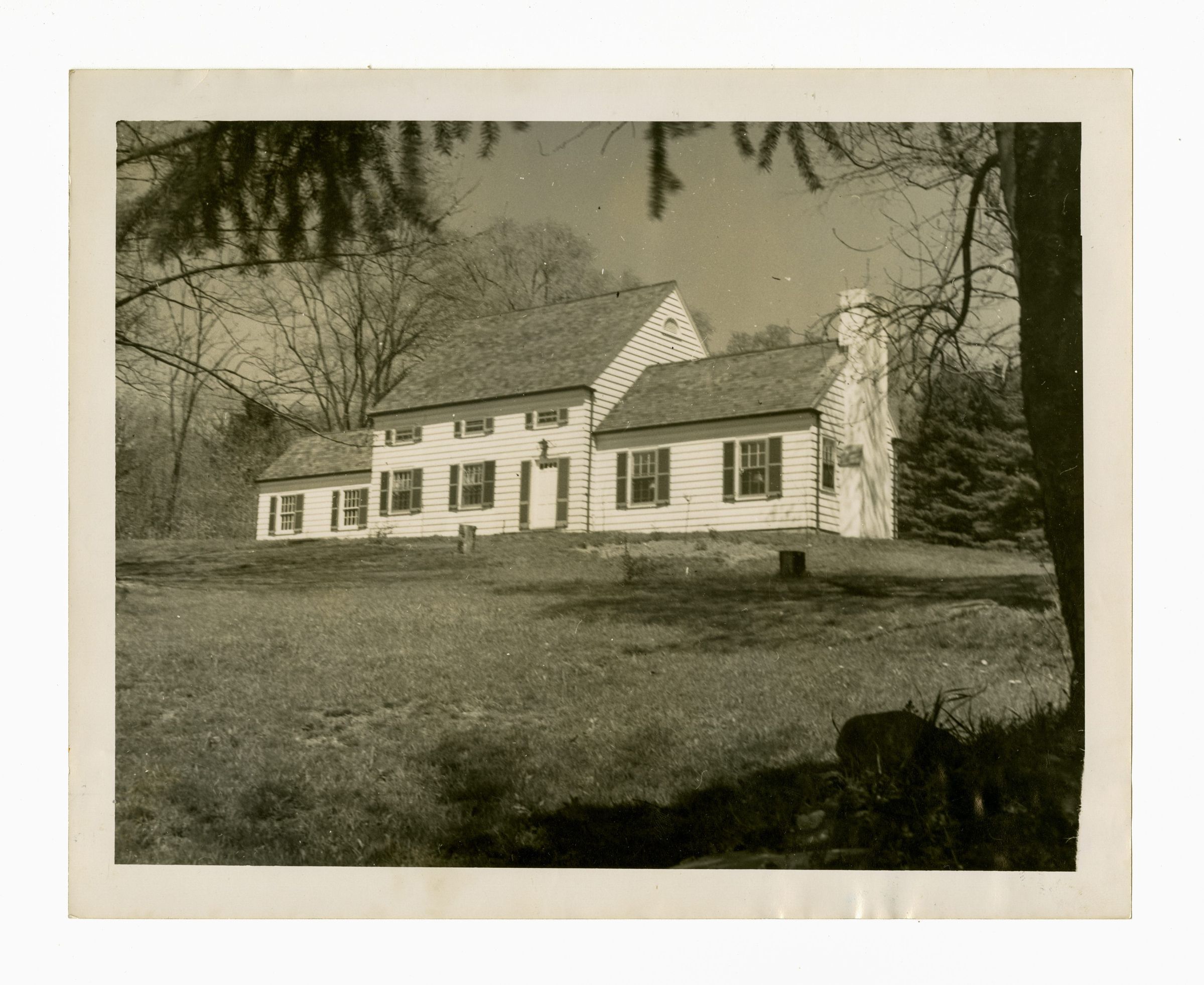 A view of a two-story clapboard home and its lawn.