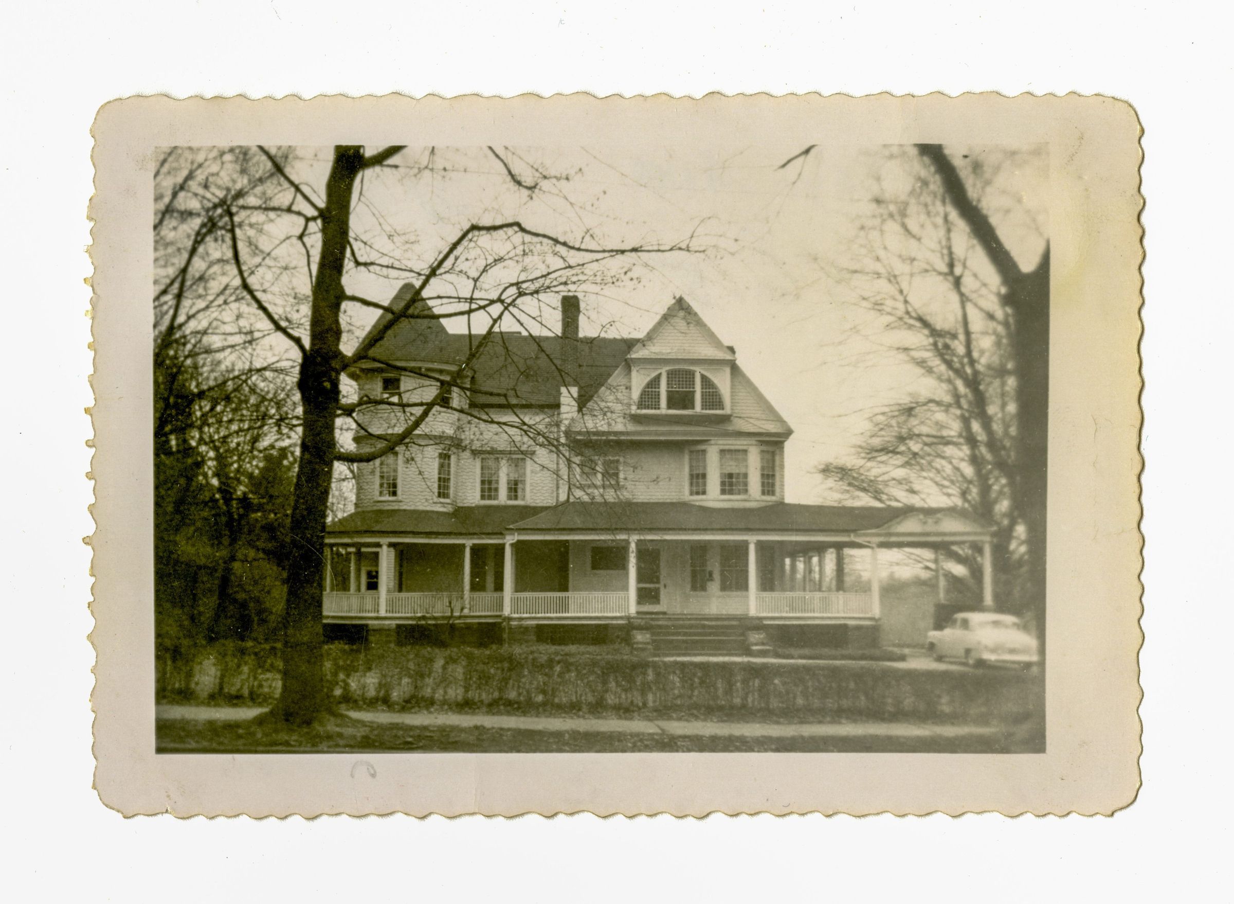 A three-story home with a large porch and a car parked in the driveway on the right of the image.