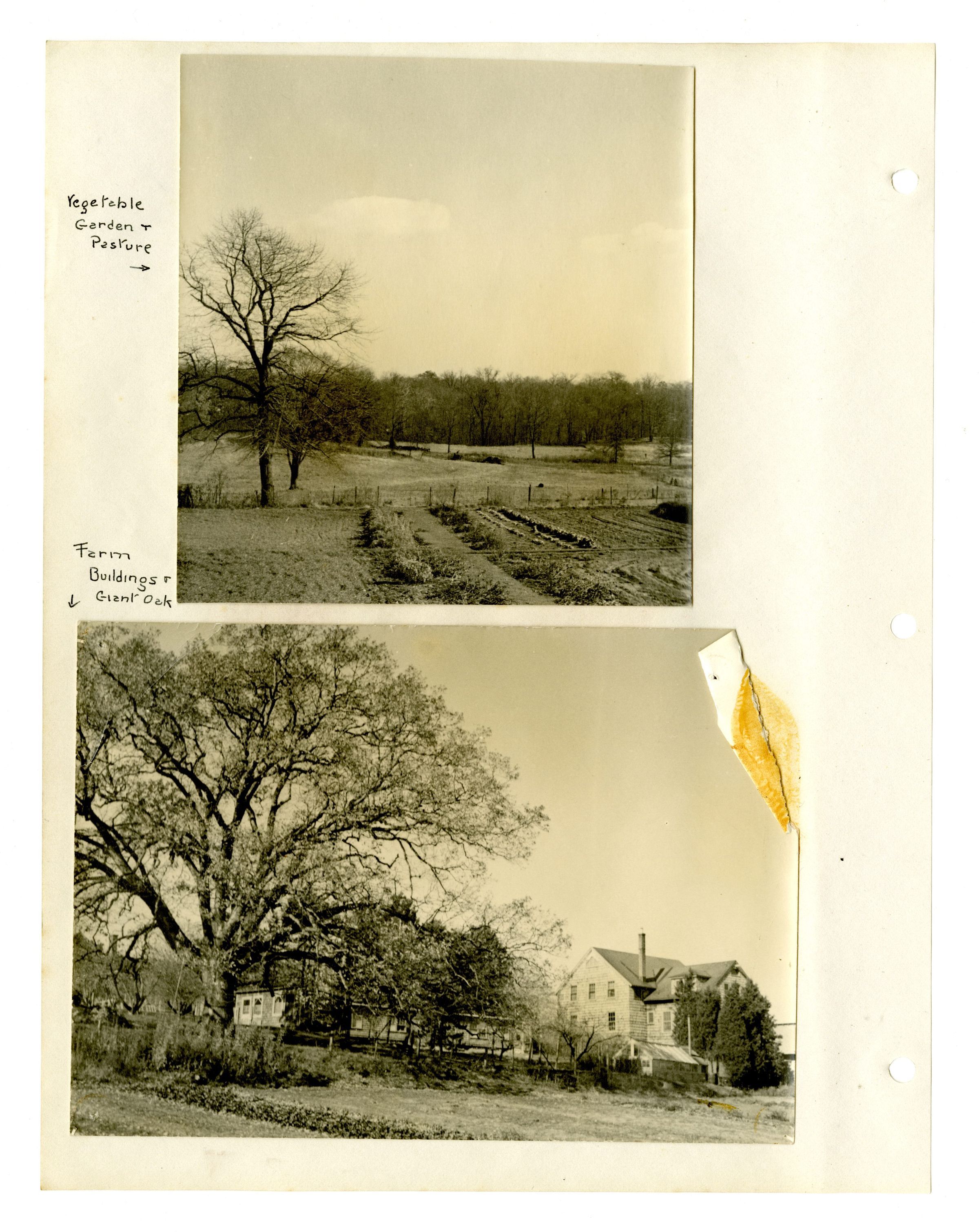Top photo depicts the vegetable garden and pasture on the site. Bottom photo depicts the farm buildings and a giant oak tree.Collection