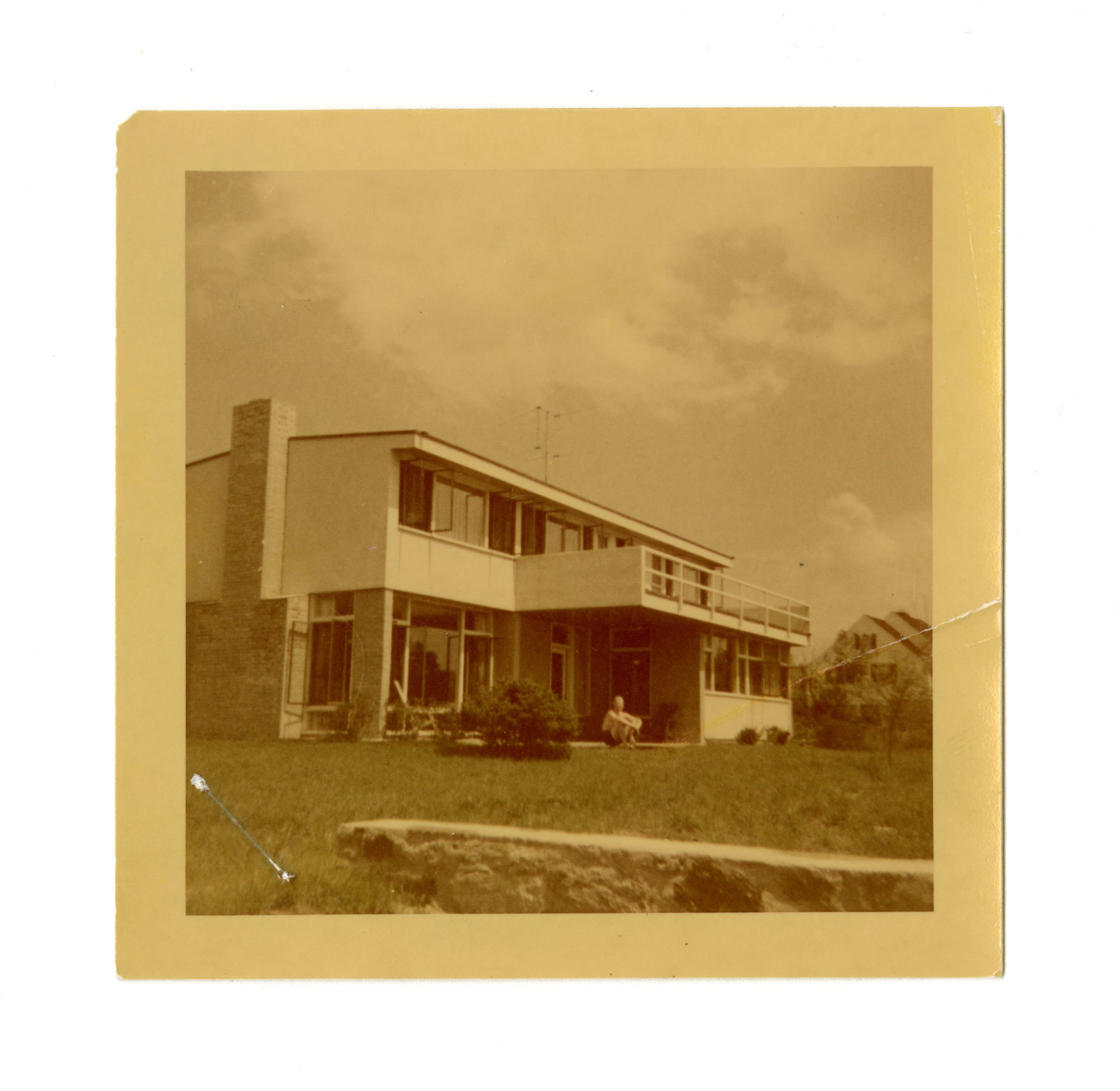 Side view of a mid-century home with a large balcony, brick chimney and a shirtless person sitting on the patio in front.Collection