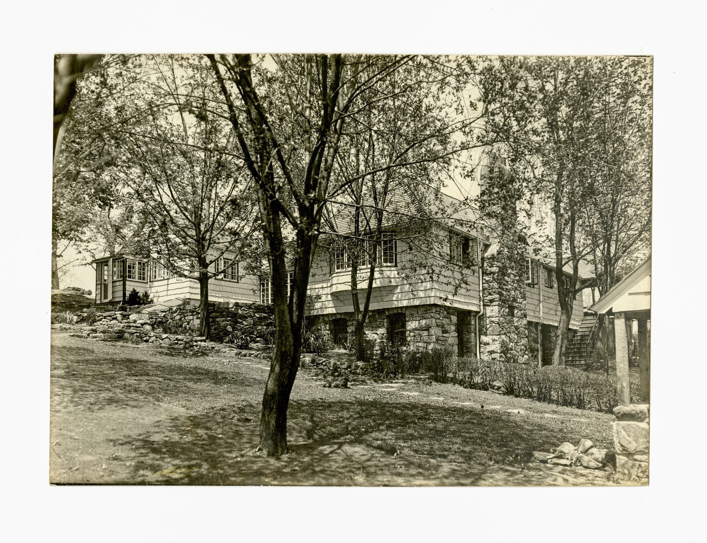 A side view of the house with shingled upper floors and stone lower walls and chimney.