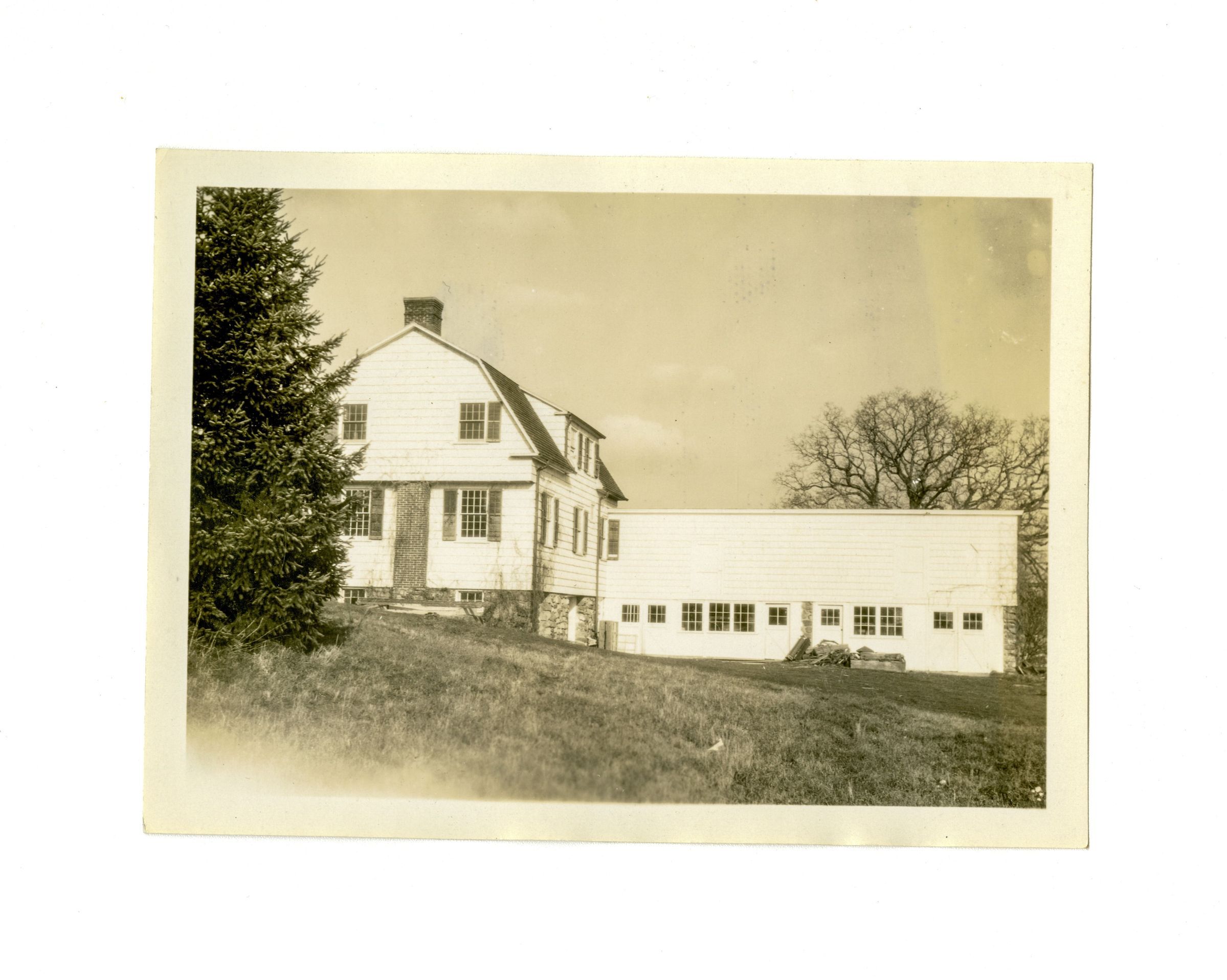 A side view of a two story home with a gambrel style roof and a rectangular extension in the back.Collection