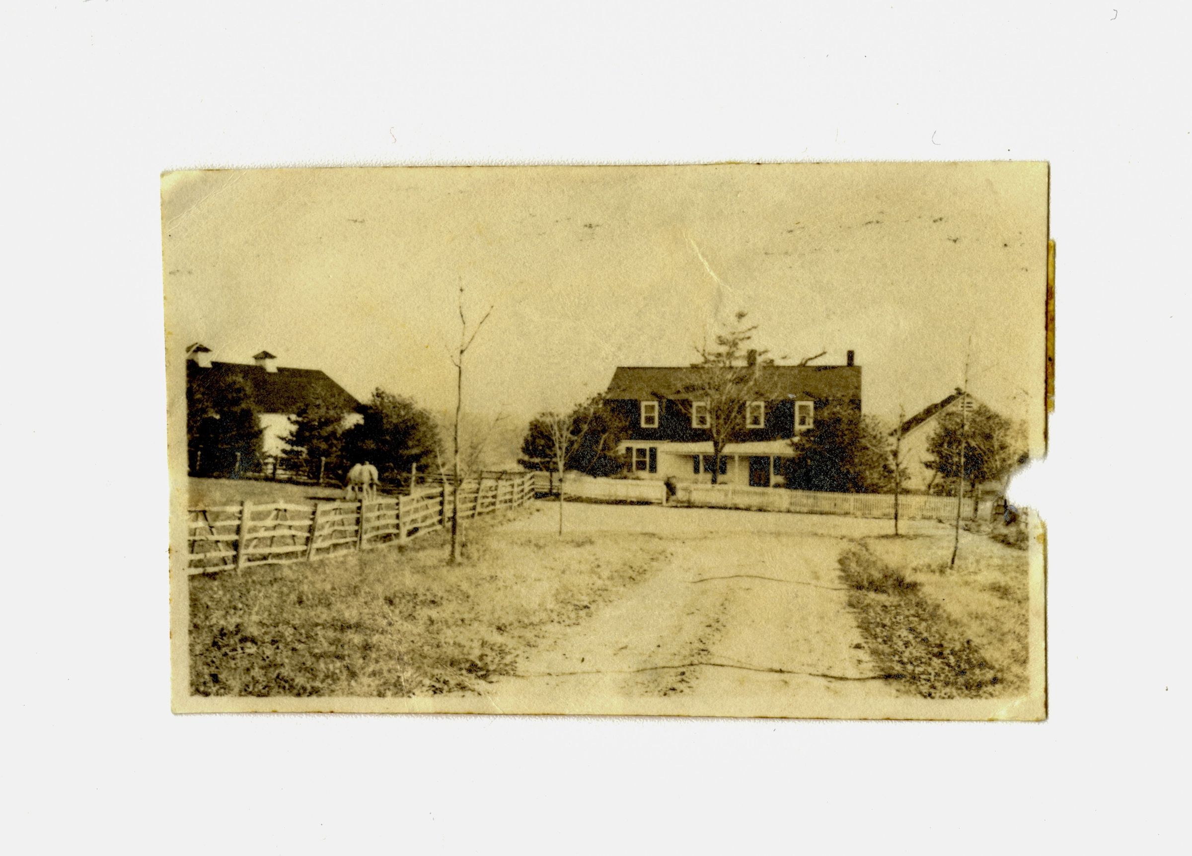 A view from a dirt road of a house on the estate with a horse paddock on the left of the image and an outbuilding in the back left.Collection