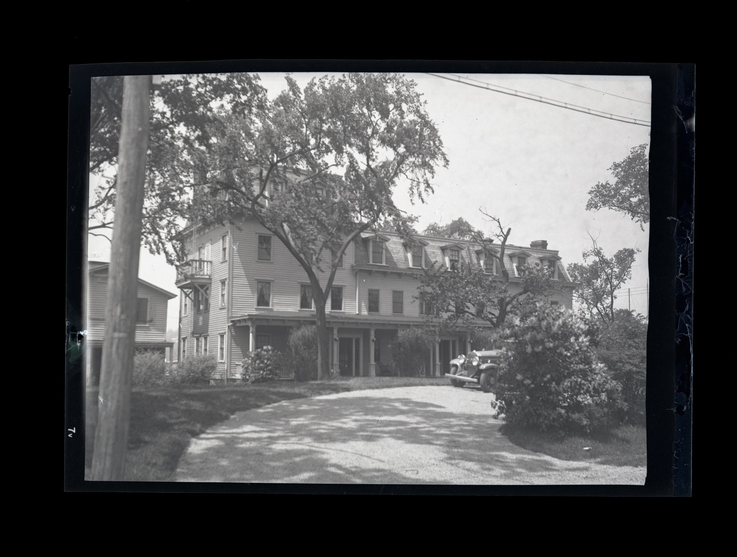 A four story Italianate house viewed from its driveway with the front of a car visible in the center of the image.Collection