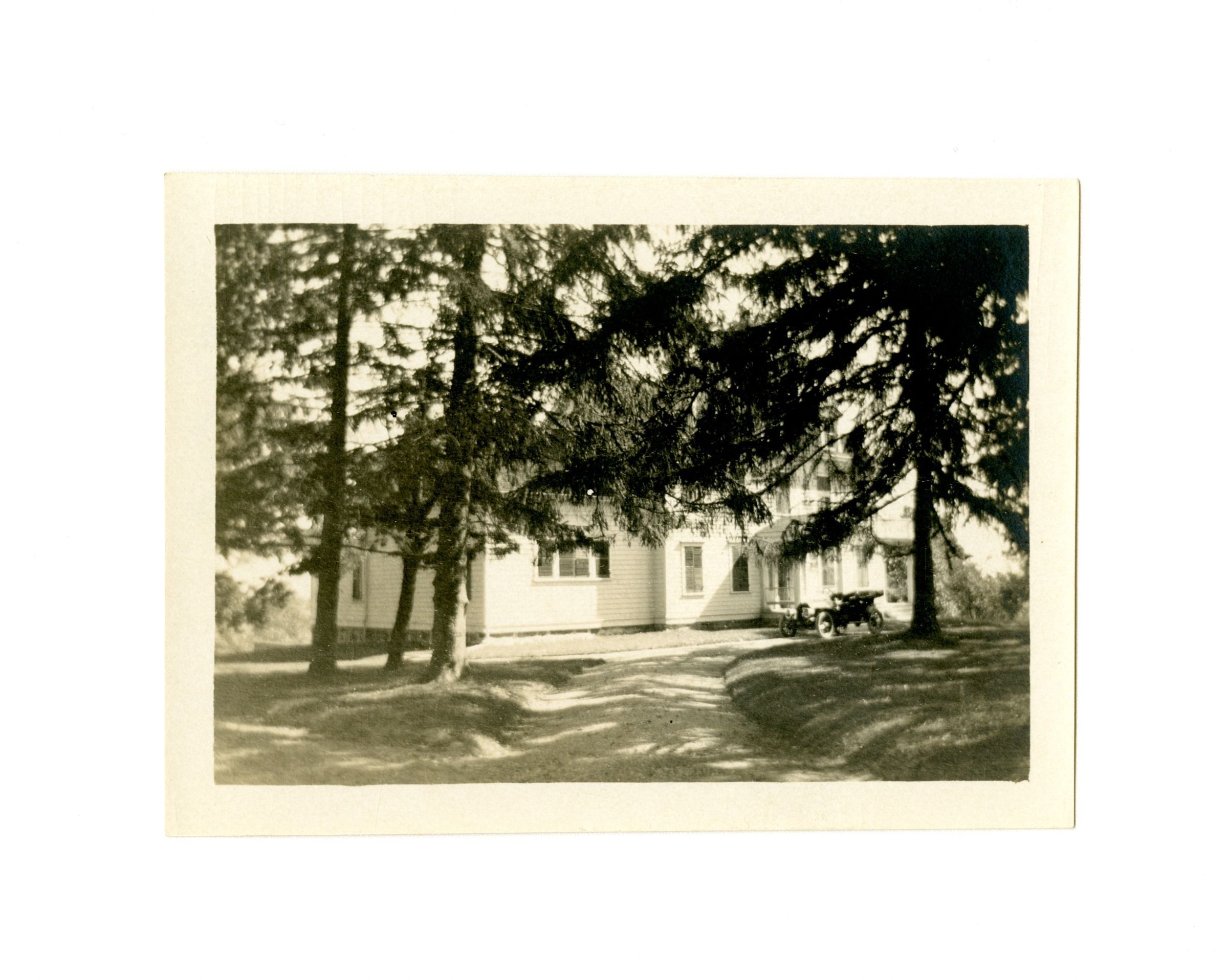 A view from the driveway of a house, partially obscured by trees. A car is parked on the driveway in front of the front door.Collection