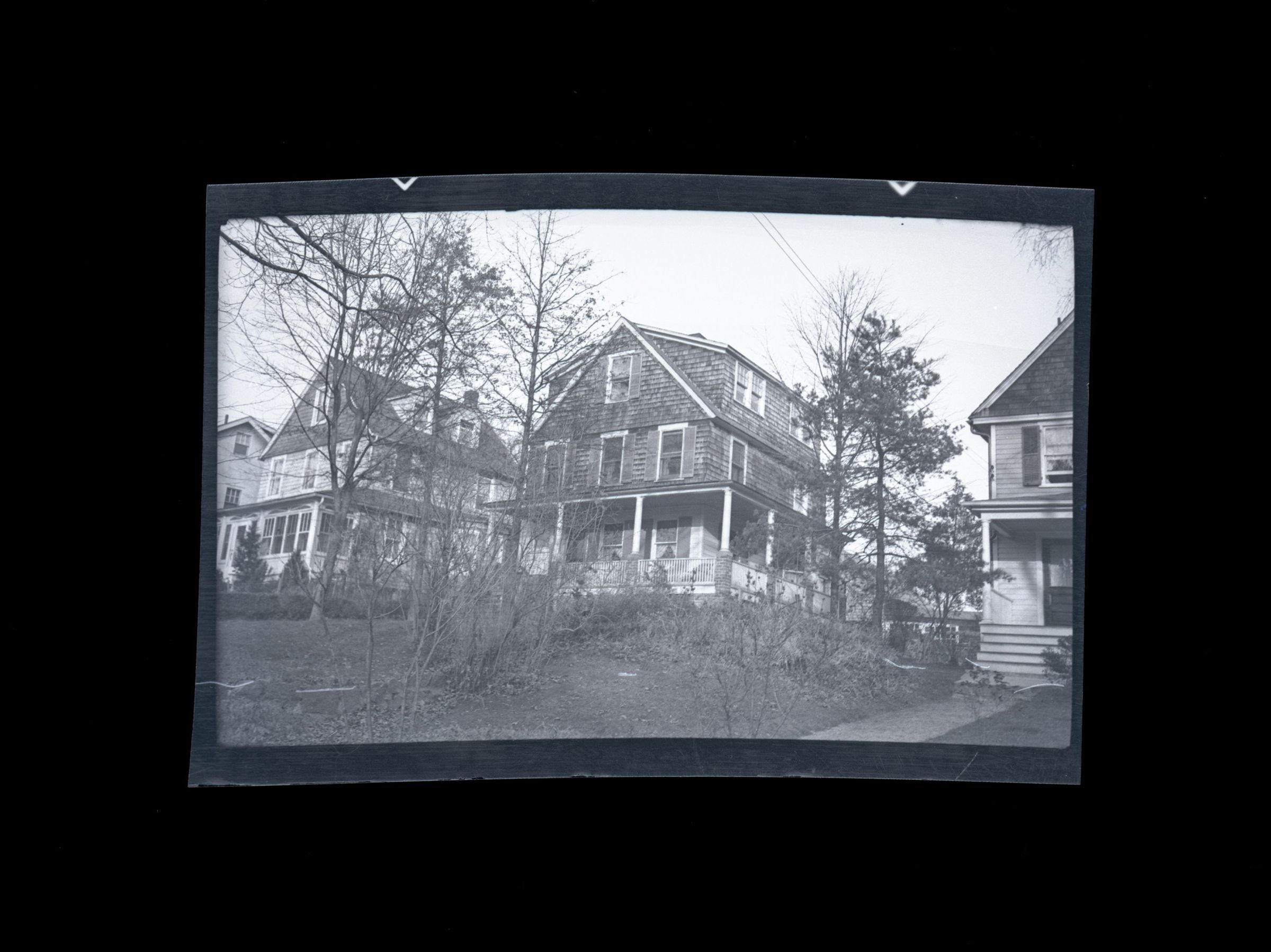 A three story shingled home with a wraparound porch. Neighboring houses are visible on either side of the image.Collection