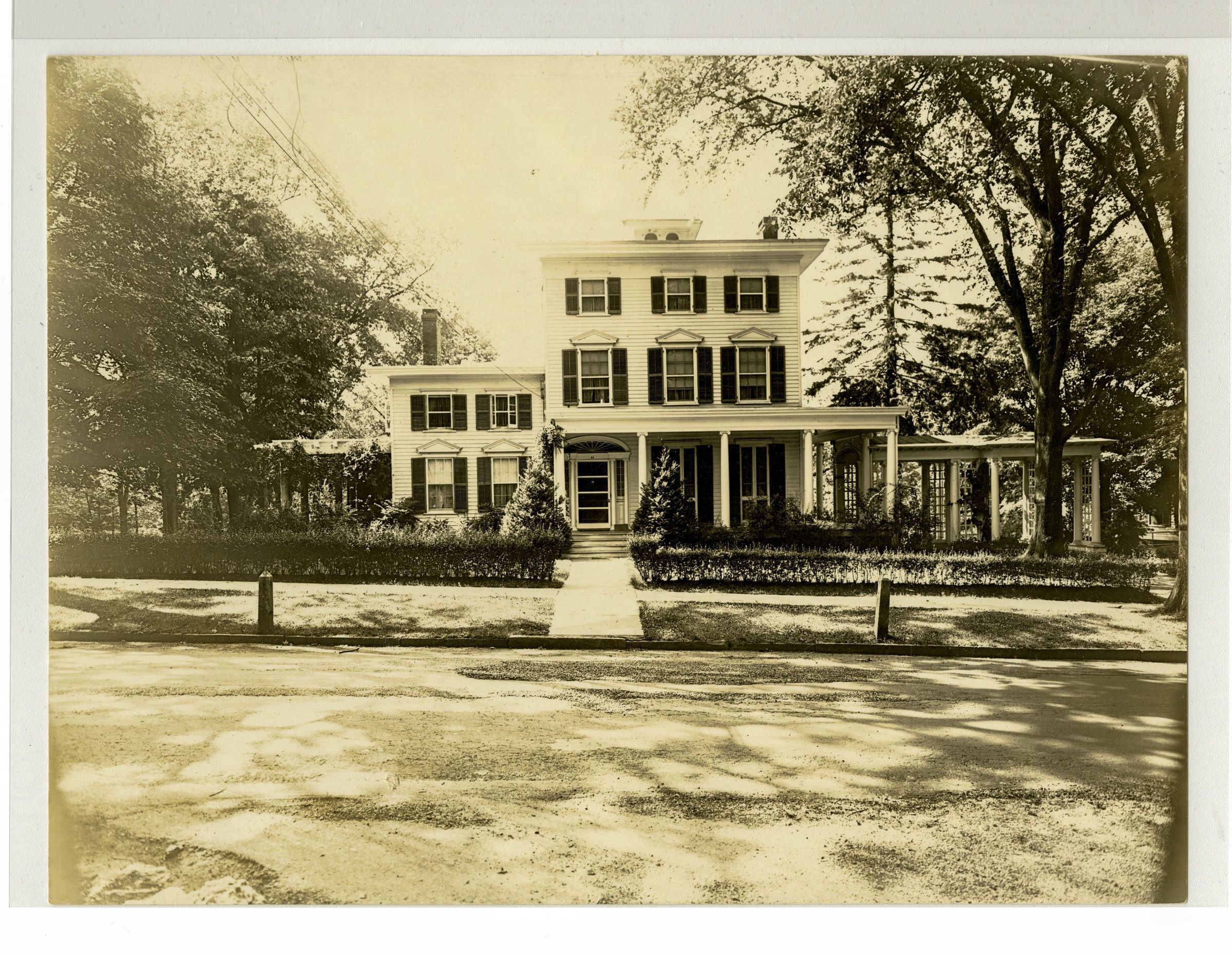 A view from the street of a 19th-century home with a large, covered porch and a covered area on the right of the image with trellises.Collection