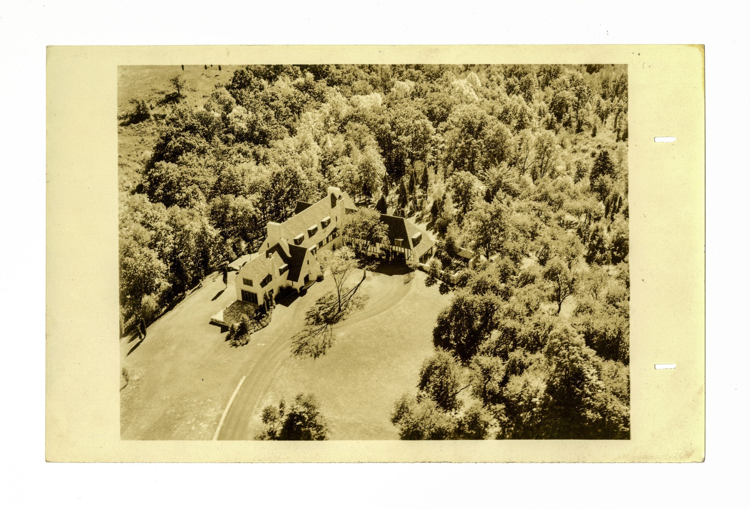 An aerial view of the estate of Raymond Brooks with the full house, gardens, and lawns visible in addition to the surrounding wooded area.Collection