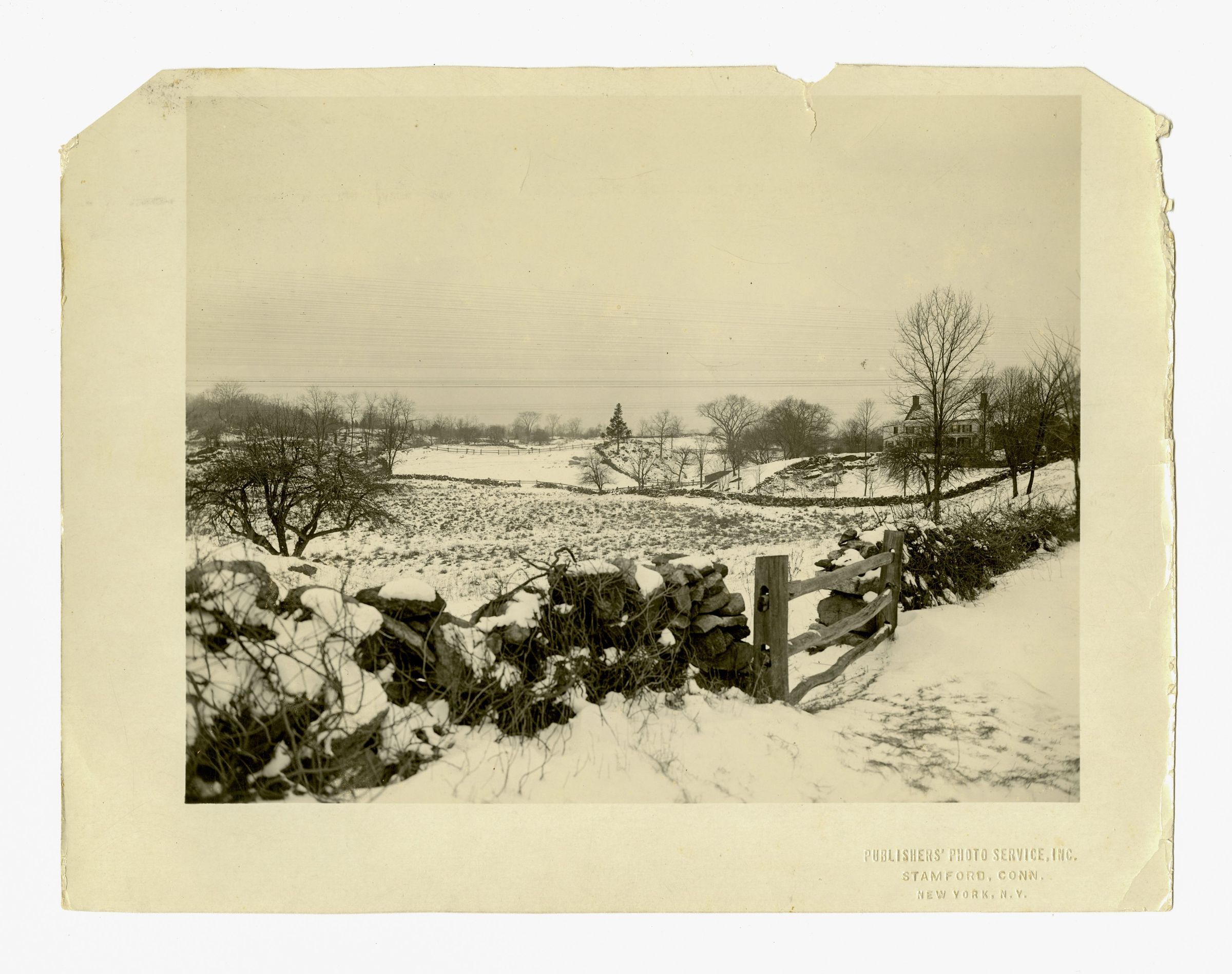 A view of the property, with the house in the back right of the image and a stonewall in the foreground, in the snow.Collection