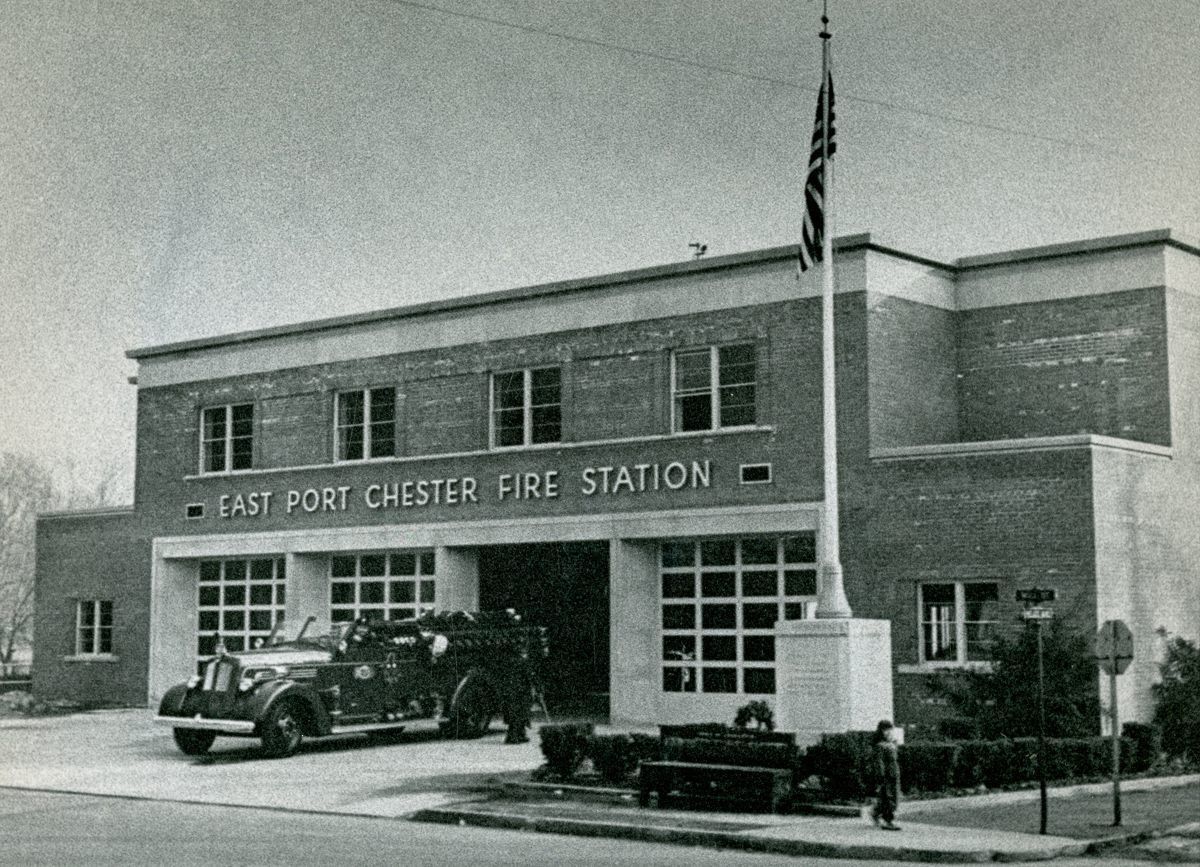 The East Port Chester fire station building with a fire engine in its driveway.Collection