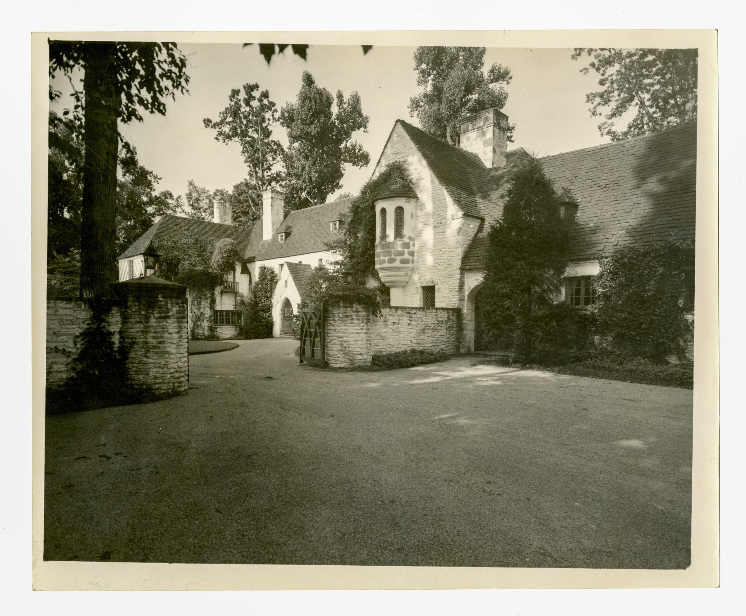 A view of a section of a stone, "French-Norman" style house with the courtyard visible through an entranceway in a stonewall.Collection