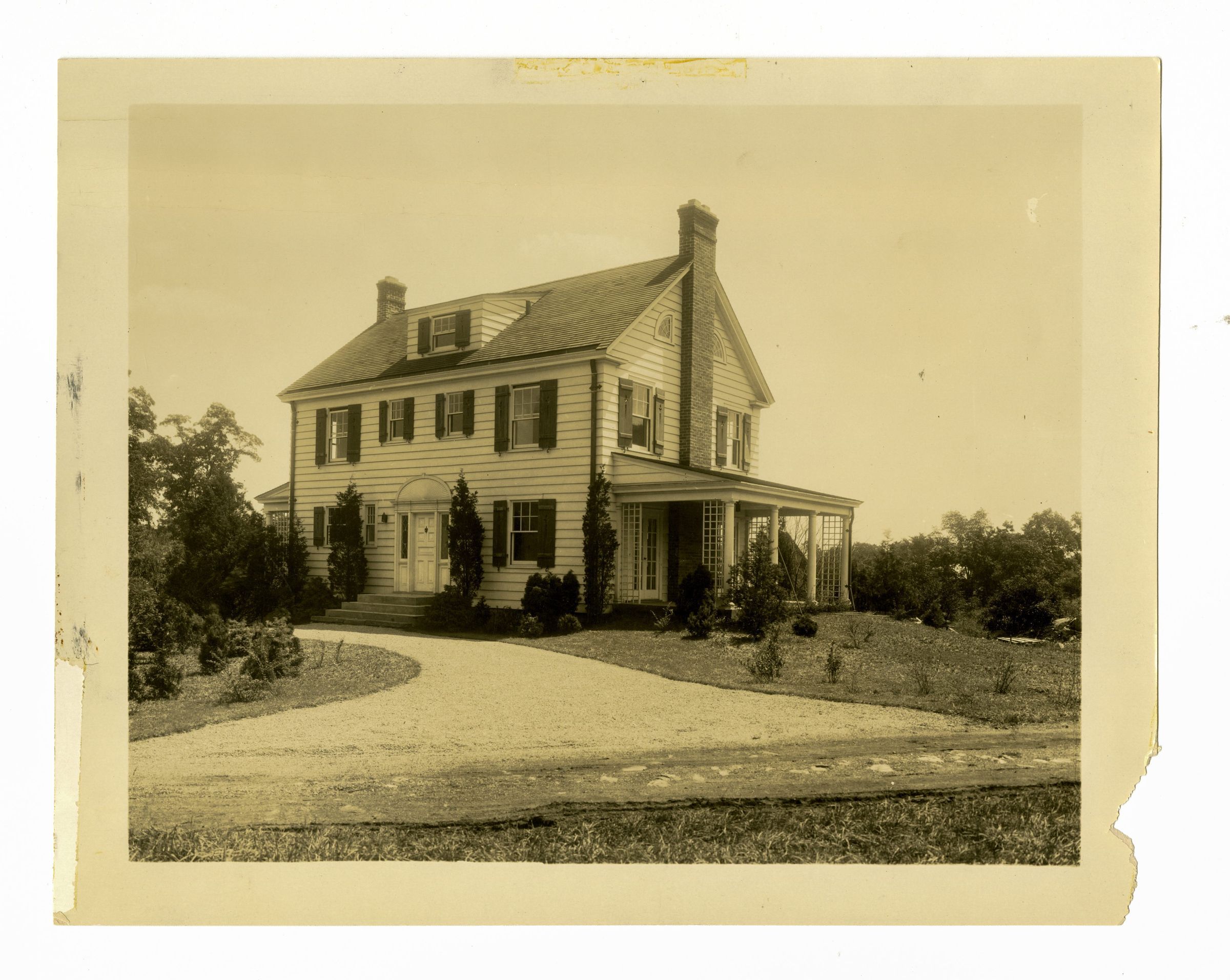 A clapboard home with two brick chimneys and a small patio on the right of the image.