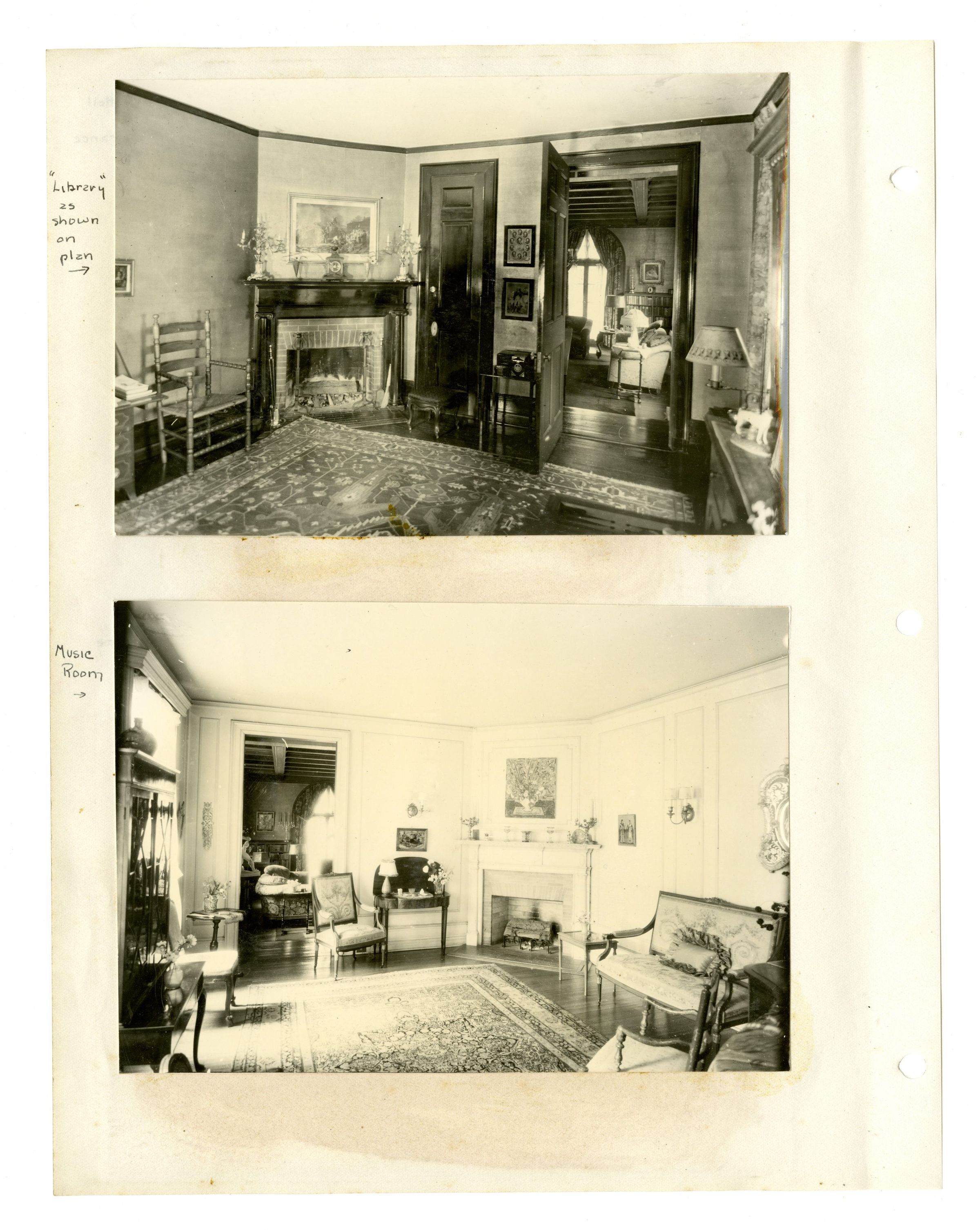 Top photo is a view of a room with a fireplace and an open door leading to the library. Bottom photo is a view of the music room.Collection