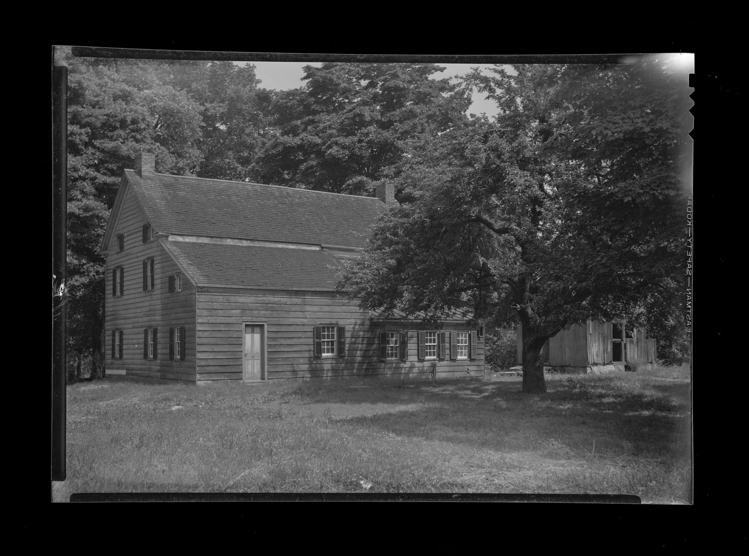The rear of a saltbox-style shingled house.