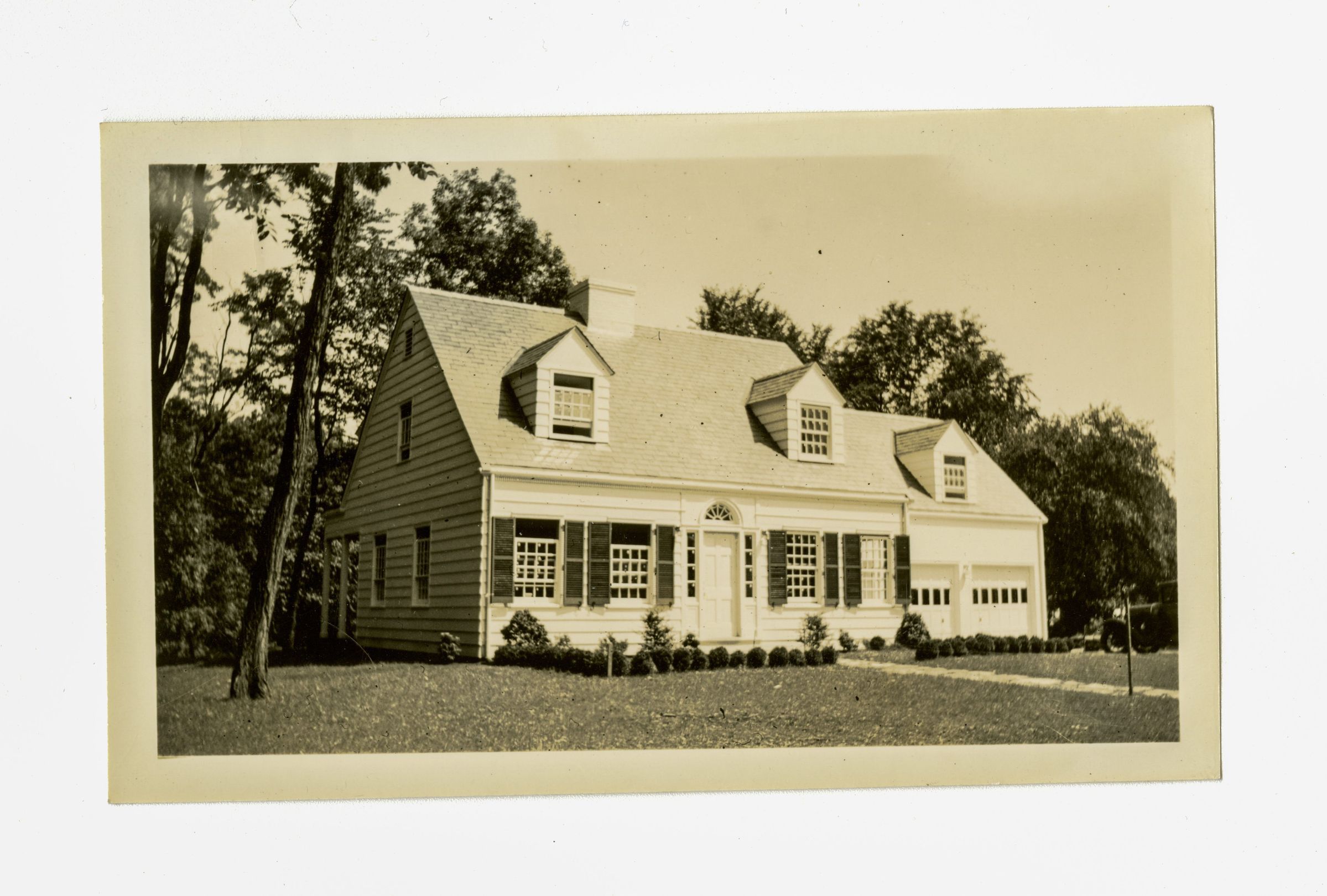 A front view of a two-story clapboard house with a two-door garage on the right of the image.