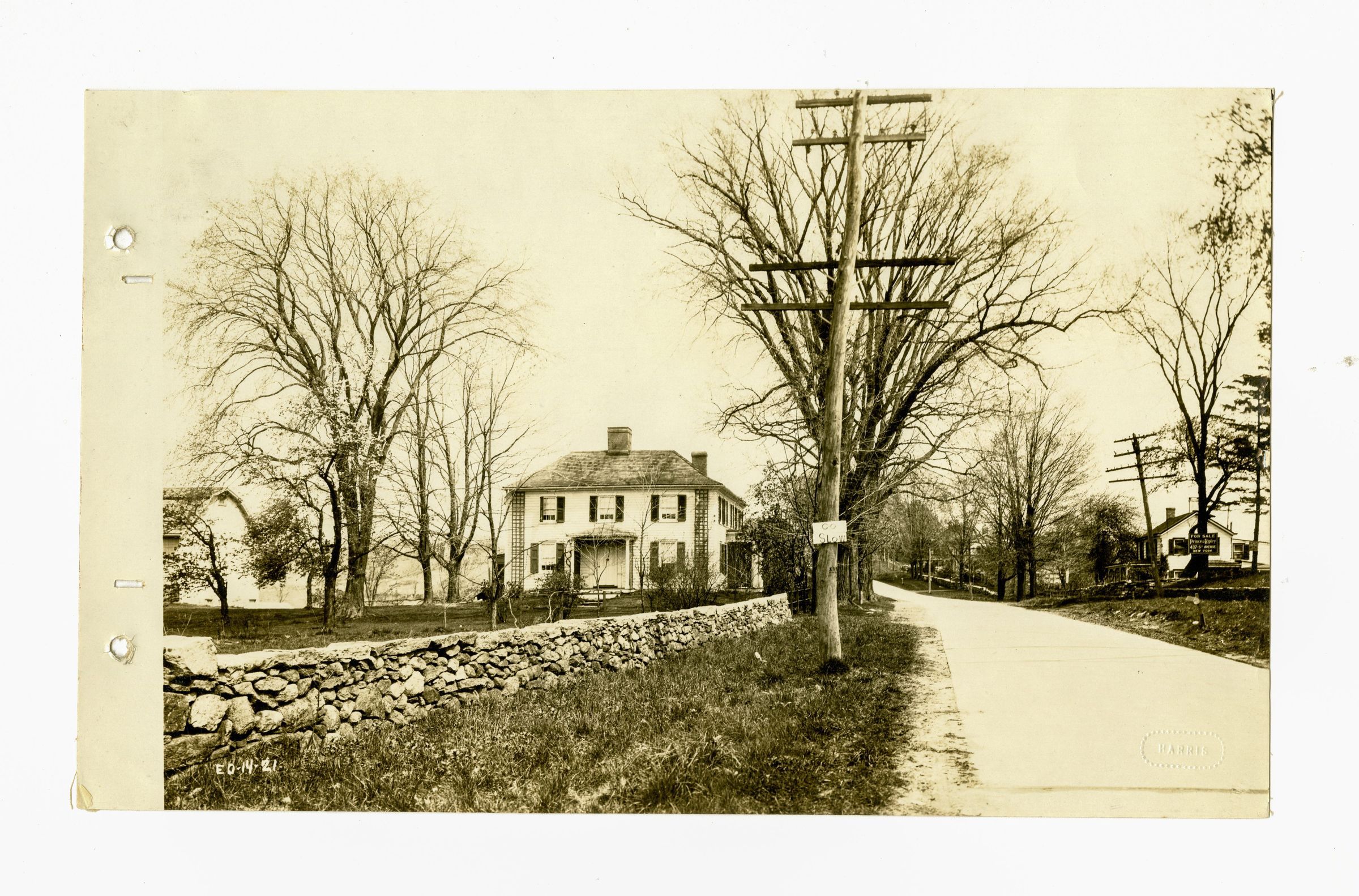 A view of a two-story home from the street with a stonewall on the left of the image.