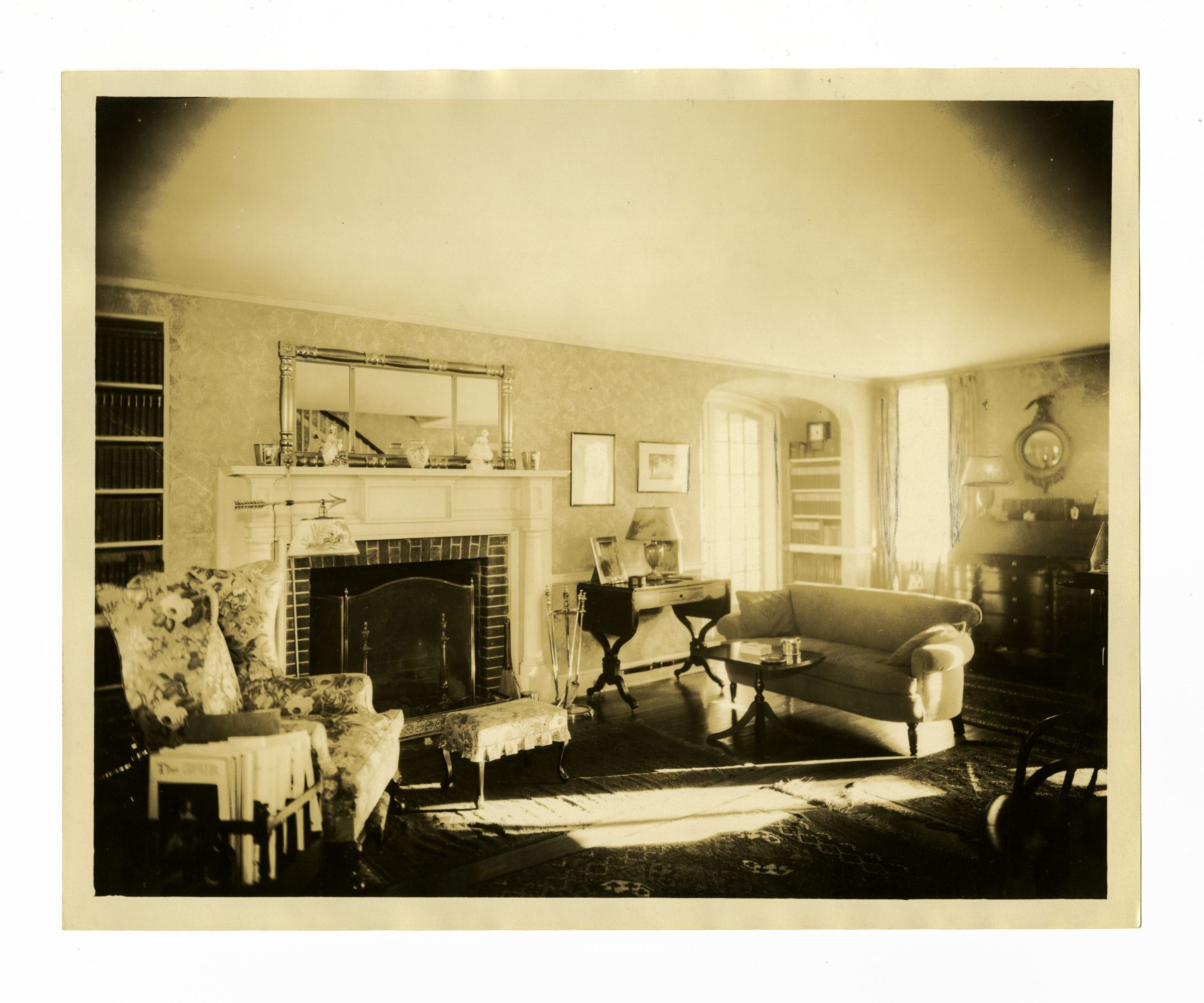 A view of part of a living room with a couch, armchair, and fireplace visible.Collection