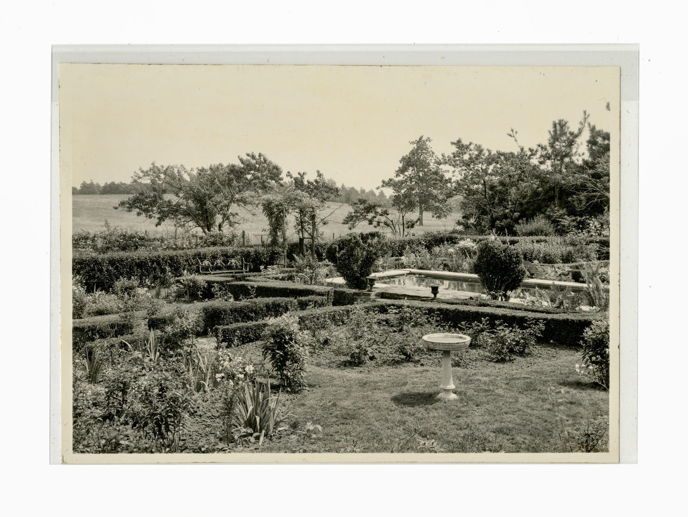 A view of part of the estate's gardens with a small pool of water on the right of the image.