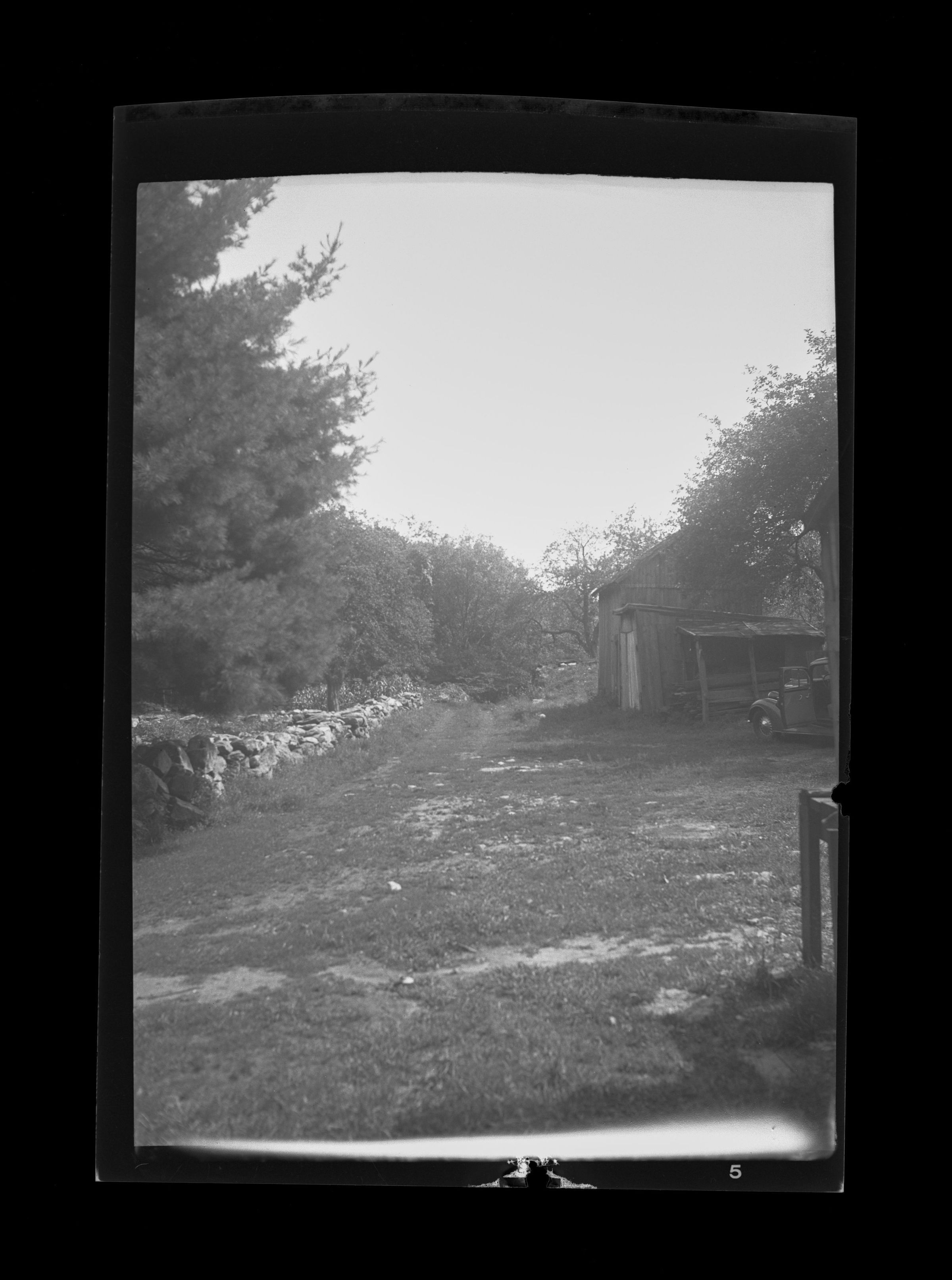 A view of a shingled building and stonewall. A car is parked with its door open on the right of the image.Collection