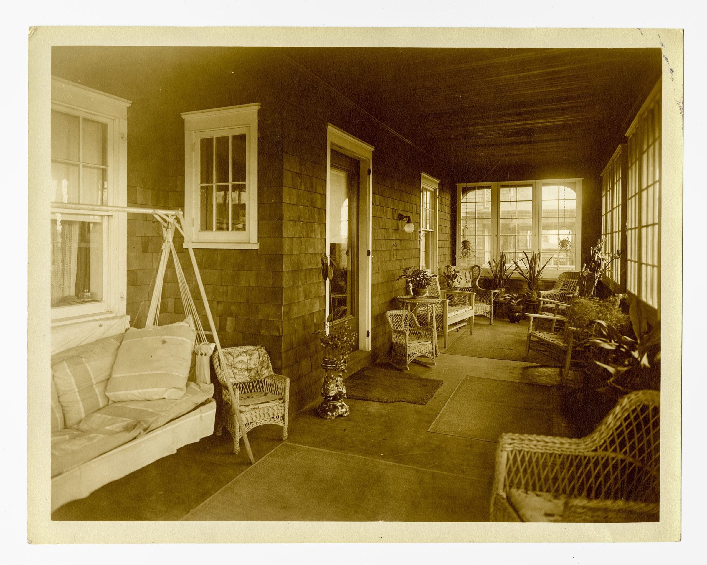 A view of the porch closed in for the winter with several pieces of wicker furniture.